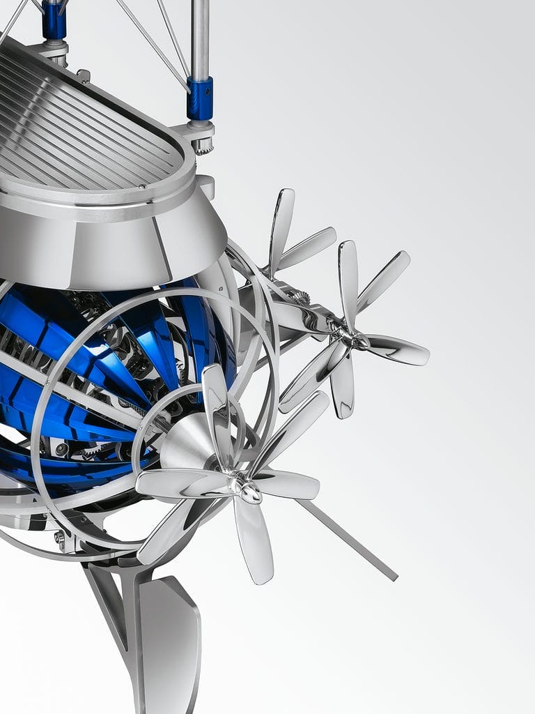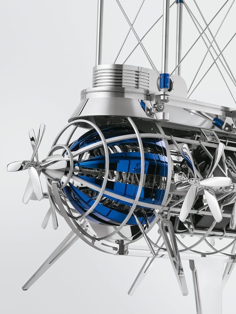 L’aéronef abrite deux mouvements, avec deux systèmes de remontage qui alimentent d’une part l’horloge et la sonnerie, via deux barillets distincts, d’autre part les hélices, via un troisième barillet. On remonte le premier mouvement à l’aide des hélices placées à l’avant de la machine volante : dans le sens des aiguilles d’une montre pour la sonnerie, dans le sens inverse pour l’horloge. Les hélices situées à l’arrière servent au remontage de l’automate. En ce qui concerne la réserve de marche, on dispose d’une autonomie d’environ huit jours pour l’horloge – que la sonnerie soit activée ou non – et d’un jour pour l’automate.