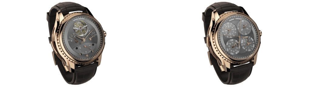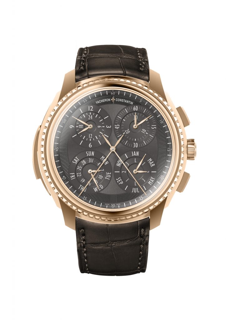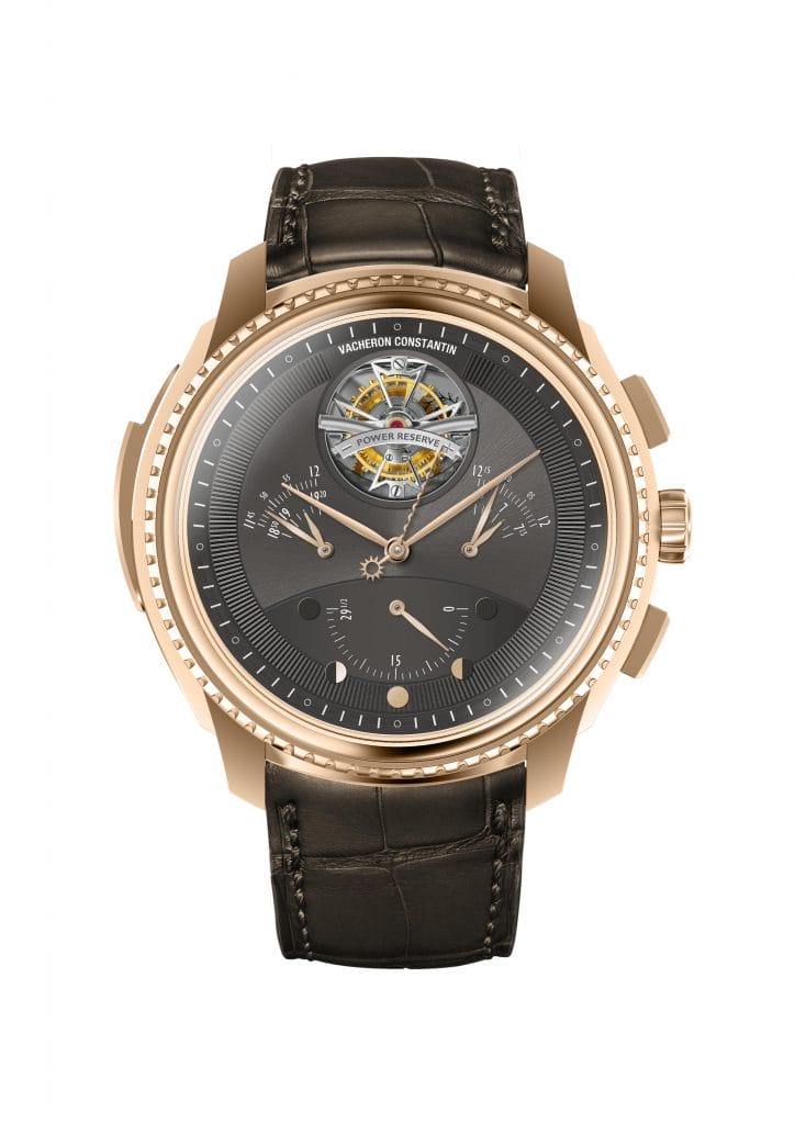 Avec ses multiples fonctions et affichages, cette pièce est un véritable défi horloger. Technique tout d’abord, avec ce calibre développé par la même équipe que la Référence 57260, le moindre détail a été pris en considération. Comme par exemple l’isolateur du levier de rattrapante, conçu dans un souci de gain énergétique pour une pièce qui dispose ainsi d’une remarquable réserve de marche de 65 heures, voire 40 heures chronographe enclenché. Esthétique ensuite, afin d’assurer une parfaite lisibilité des deux cadrans anthracite aux finitions soleillées et guillochées sur la circonférence. Ce sont d’ailleurs les options esthétiques liées à l’affichage qui ont dicté la construction du calibre dans une approche pluridisciplinaire. Il en résulte une montre exceptionnelle dont les généreuses proportions de 50 millimètres de diamètre pour 21 millimètres de hauteur sont adoucies par les courbes du boîtier en or rose. Le bracelet en cuir d’alligator complète l’esthétique de cette montre qui s’inscrit en digne héritière de la Haute Horlogerie et de ses traditions.