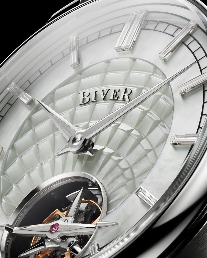 Deux autres éléments particuliers de ces cadrans méritent d’être soulignés. D’une part, il y a la forme plus longue que large des index en diamant baguette qui apporte une sophistication et un effet de fluidité aux pierres précieuses. D’autre part, un œil averti remarquera dans le guillochage central la petite partie en aplat permettant de venir fixer une à une chaque lettre en or qui compose l’inscription Biver. « Ce sont de petits détails, mais ils sont significatifs de l’importance que nous entendons donner au moindre élément, tant dans sa conception que dans sa réalisation. Si rien n’est standard, c’est parce que nous nous sommes engagés dans une quête de beauté qui passe par des critères de sélection et de contrôle drastiques. Notre engagement dans le sens de ce qui nous apparaît comme la perfection est identique pour tout élément de nos montres, qu’il s’agisse des sommets rabotés et des angles polis de nos aiguilles dauphine ou de l’anglage des composants de nos mouvements. Toutes les parties d’une montre sont nobles et méritent une même attention et une même ambition » assume Pierre Biver, en expliquant que « les savoir-faire doivent être mis à la disposition d’un travail d’exécution tourné vers l’esthétique. La beauté du geste, c’est de pouvoir être le geste créateur de beauté ».