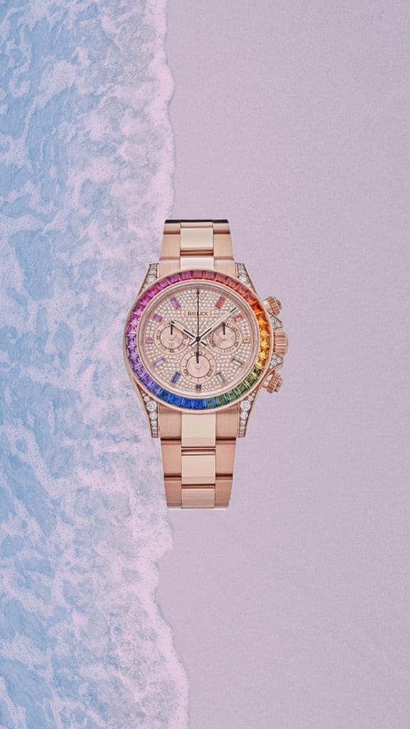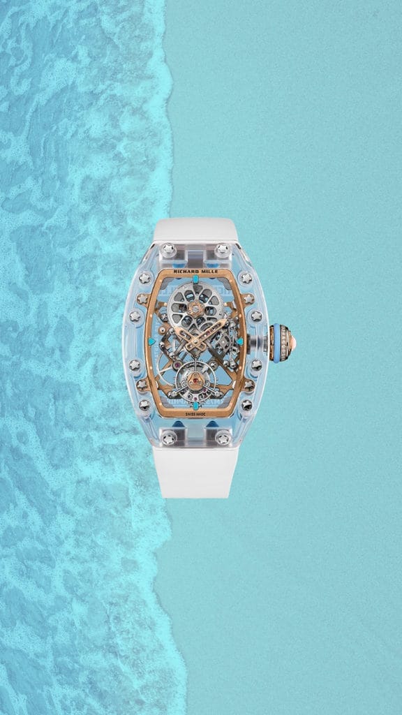 Prenons la Rolex Cosmograph Daytona en or Everose et lunette Rainbow : un feu d’artifice de pierres précieuses qui transcende la haute horlogerie. En contrepoint, la Zenith El Primero avec son cadran habillé d’un bleu profond procuré par l’emploi du lapis-lazuli s’impose avec sobriété, mais sans perdre en modernité estivale. Dans une veine plus futuriste, Richard Mille s’aventure dans la transparence et les reflets givrés, telle une monture glacée en plein soleil.