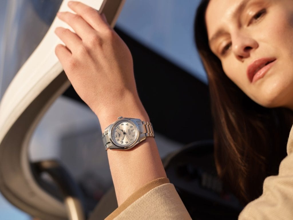 Pour un style plus décontracté, elle se porte aussi sur bracelet cuir avec surpiqûres blanches, de couleur beige pour la version cadran champagne, brune pour le cadran noir et en ton sur ton pour la version bleue.
