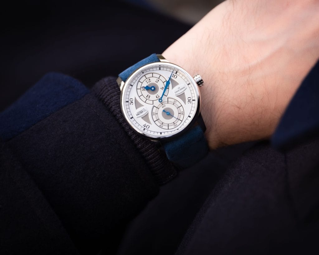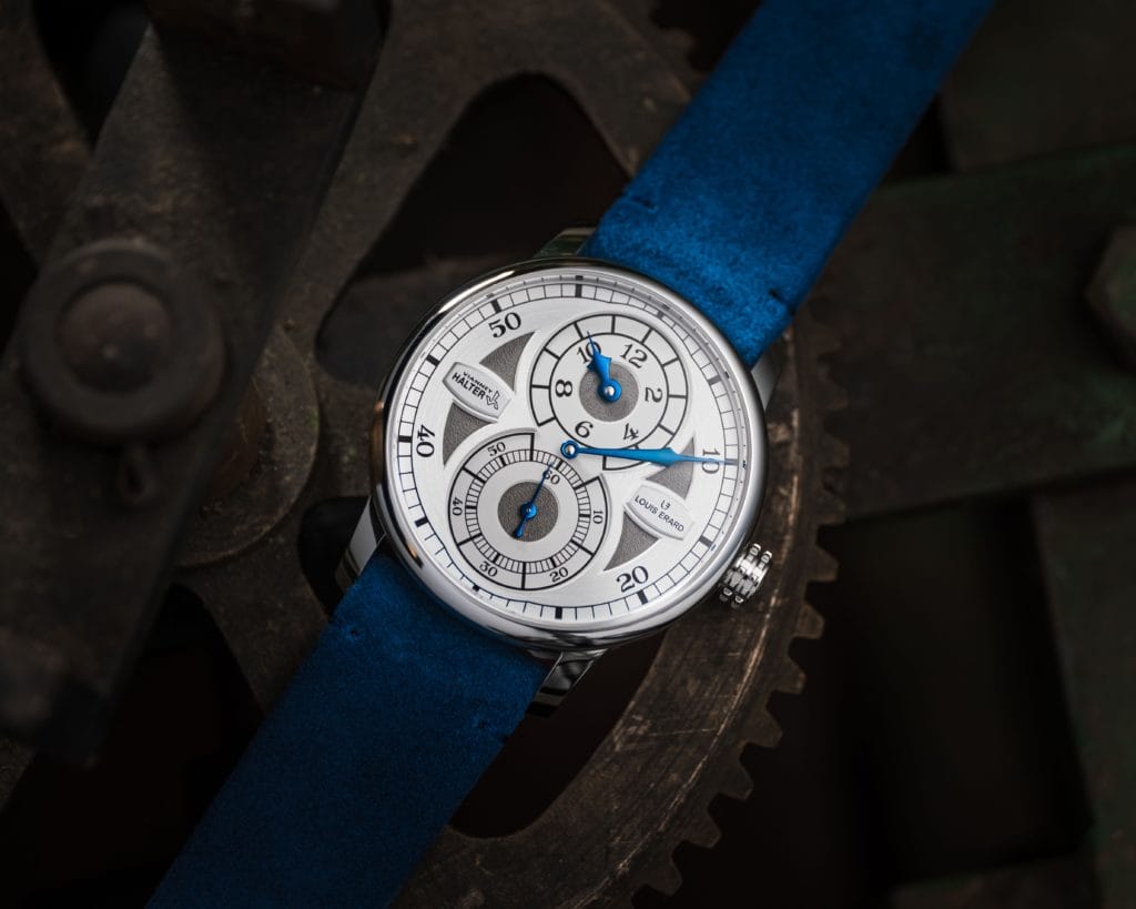Dans son style bien à lui, que Vianney Halter nomme « futur antérieur » – autrement dit : que serait les montres du 19e siècle si elles étaient créées dans le futur ? – l’horloger a commencé par sculpter le cadran, afin de donner de la profondeur à chacun des trois compteurs. Puis il a taillé les aiguilles en acier bleui, une première pour Louis Erard. La minute est indiquée par une longue aiguille plume : finesse de l’indication finale, mais belle présence au centre. Les heures sont aussi indiquées par une aiguille plume, mais trapue, pour accrocher l’œil avant les autres. La seconde est simplement équilibrée, avec son contrepoids, pour ne pas en perturber la marche.