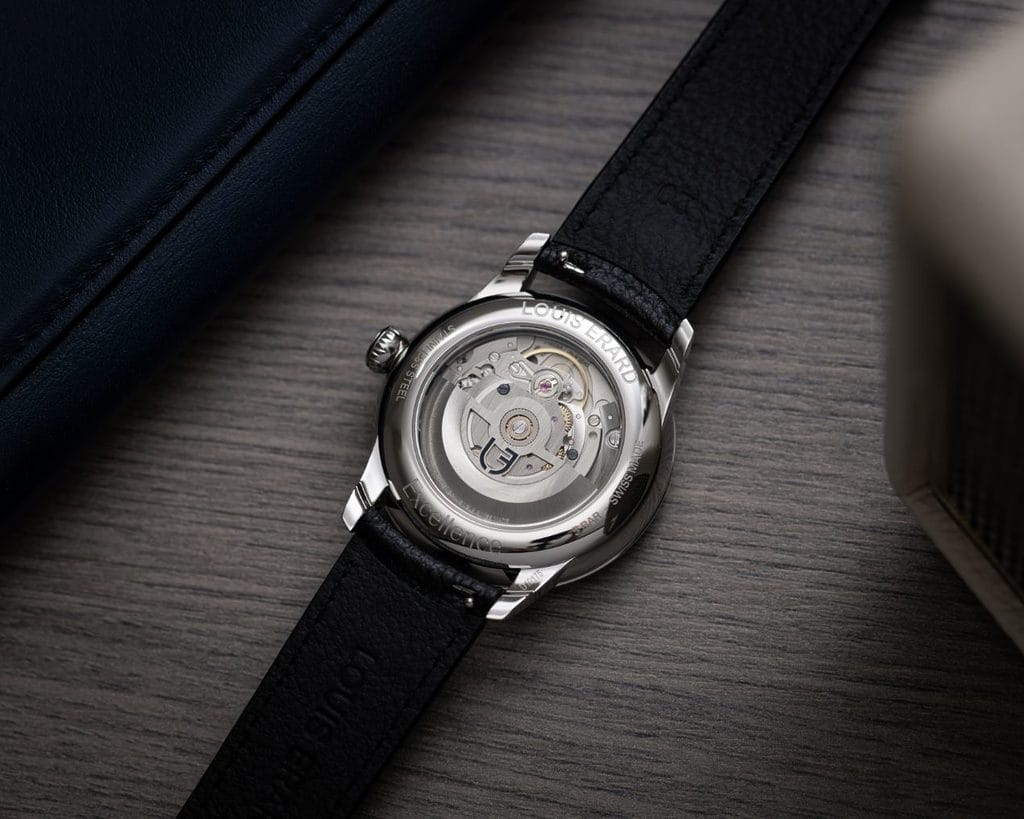 Mouvement Automatique, calibre Sellita SW261-1, 3 aiguilles avec petite seconde à 6H, 11½’’’, Ø25.60 mm, hauteur : 5.60 mm, 31 rubis, 28,800 A/H (4Hz), mouvement version élaborée, masse spécialement ajourée avec symbole Louis Erard laqué noir, env. 38 heures de réserve de marche