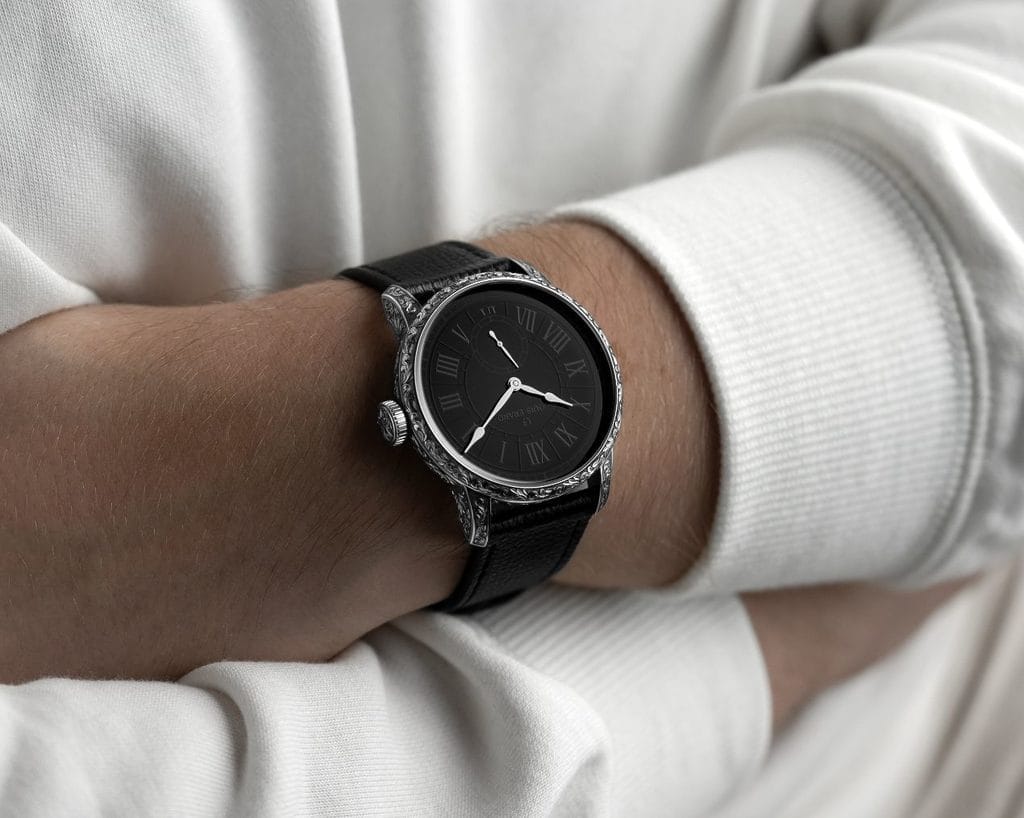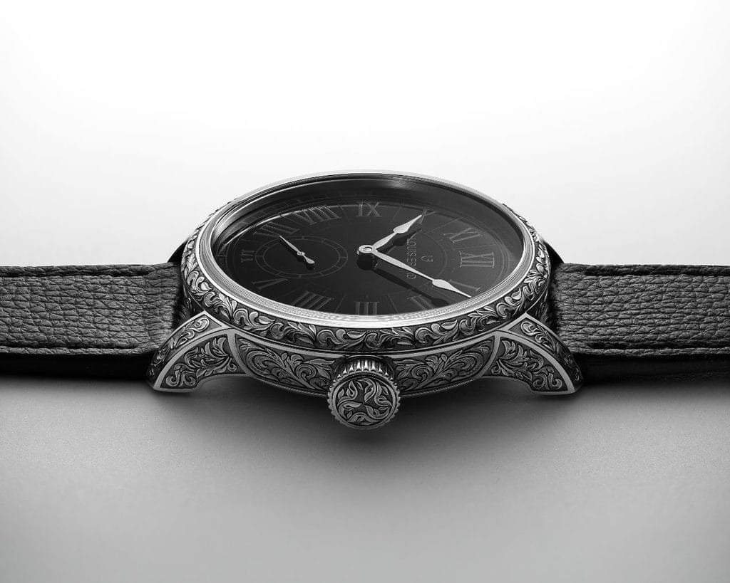 Le processus de création est long et minutieux. Le graveur conçoit le motif, le transfère sur l’acier à main levée ou à l’aide d’un pochoir. Différents burins sont utilisés selon le niveau de détail recherché. La surface est pré-entaillée à la pointe sèche pour guider la gravure. Chaque ligne est creusée millimètre par millimètre, suivant les courbes et les angles du boîtier. Viennent ensuite les détails, les ombrages et les textures. Le boîtier est ensuite poli, ses contrastes révélés et son équilibre visuel vérifié. Le cadran, volontairement sobre, mêle chiffres romains et aiguilles poire dans un esprit inspiré des horloges baroques, revisité dans une esthétique contemporaine.