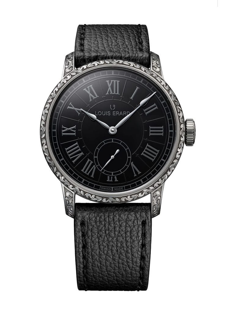 Sur le plan technique, la Gravée Main est équipée du calibre automatique Sellita SW261-1, avec heures, minutes et petite seconde à six heures. Le mouvement, doté de trente-et-un rubis, bat à 28 800 alternances par heure et offre une réserve de marche d’environ trente-huit heures. La masse oscillante est ajourée et décorée du symbole Louis Erard laqué noir. Le boîtier en acier inoxydable poli mesure 42 millimètres de diamètre, avec un entre-corne de 22 millimètres et une épaisseur de 12,25 millimètres. Le verre saphir bombé bénéficie d’un traitement antireflet double face et le fond transparent laisse apparaître le mouvement. L’étanchéité est assurée jusqu’à cinquante mètres. Le bracelet en cuir de veau grainé noir, avec coutures ton sur ton et boucle ardillon gravée à la main, est muni de barrettes à ergot permettant un changement rapide.