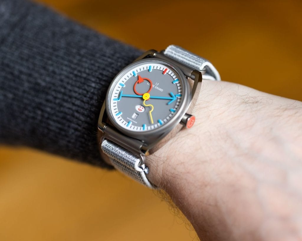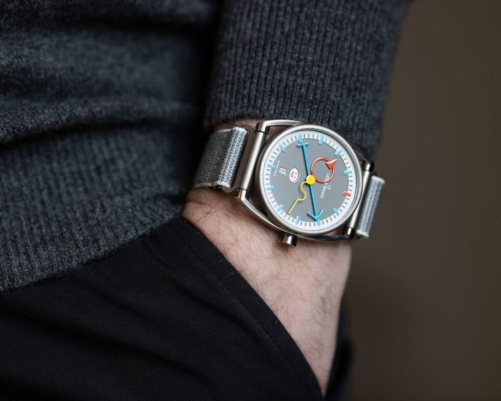 Sourire garanti avec un boîtier TONNEAU 40 mm en titane grade 2 microbillé et titane grade 5 poli, qui reprend les codes d’Alain Silberstein : construction de boîtiers avec barres arquées xxl dessinant les cornes, compteur des jours à 6H avec l’iconique smile-day, cadran 3 aiguilles inspirées du bauhaus et de kandinsky, 3 couleurs primaires et 3 formes audacieuses, 1 triangle rouge indique les heures, 1 grande aiguille des minutes en forme de flèche et 1 trotteuse jaune déstructurée pour les secondes, couronne laquée de rouge. facile à porter, à ajuster, son bracelet en nylon à scratch s’affiche dans une nuance de gris, le mythique « Stahlgrau »…, version laquée sur le cadran et brillante sur le bracelet, les connaisseurs reconnaîtront et… apprécieront !