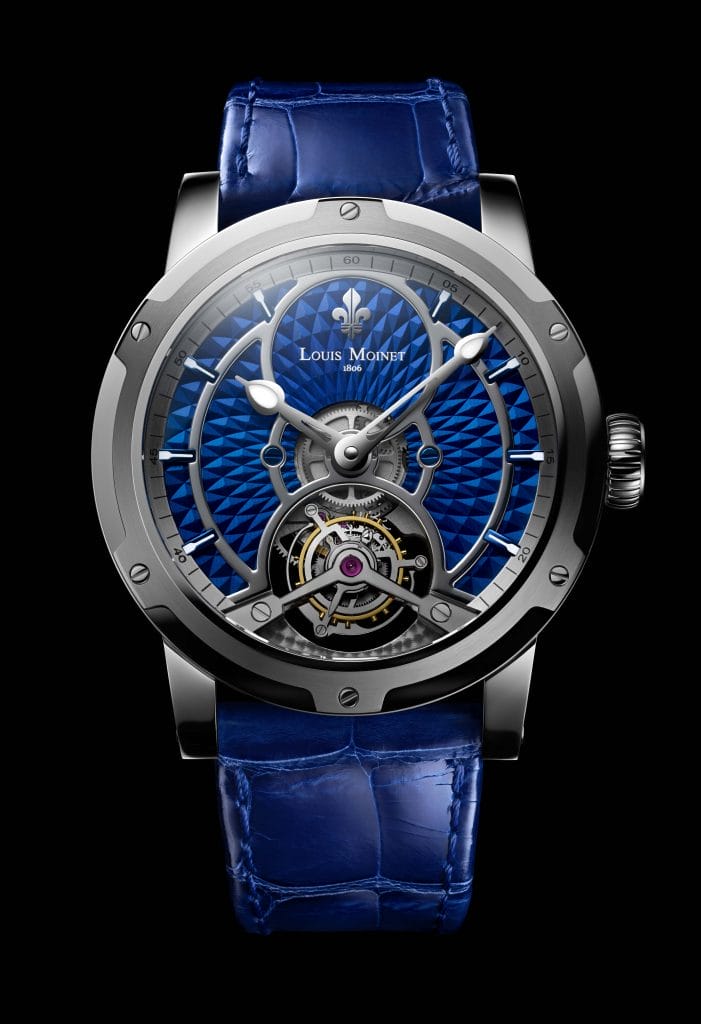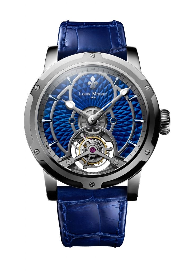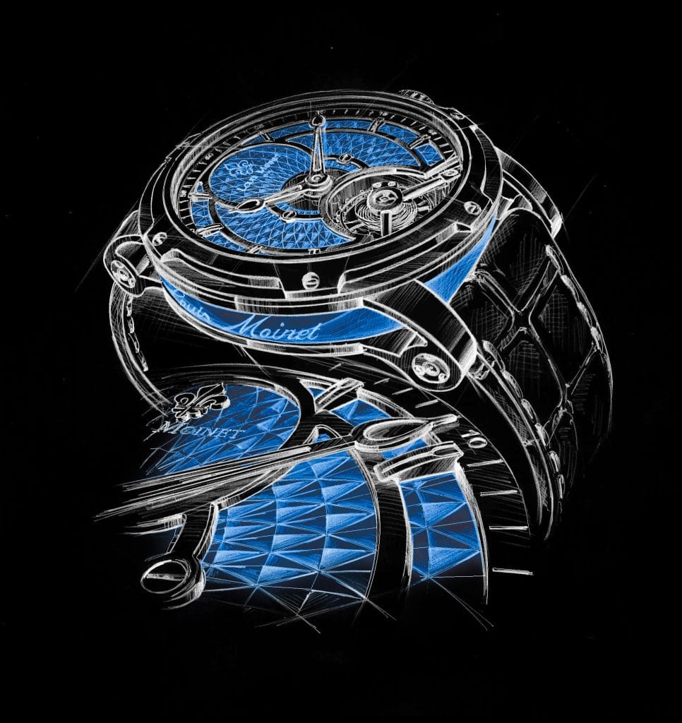 « L’idée de Mogador est de combiner l’énergie et l’harmonie de nos nouvelles couleurs identitaires, le bleu Moinet et l’argenté Polaire. Il en résulte une création puissante et épurée, mettant en valeur l’intensité des teintes » explique Jean-Marie Schaller, CEO des Ateliers Louis Moinet.