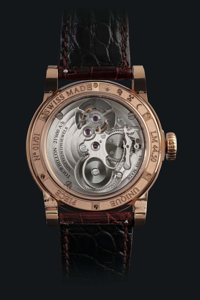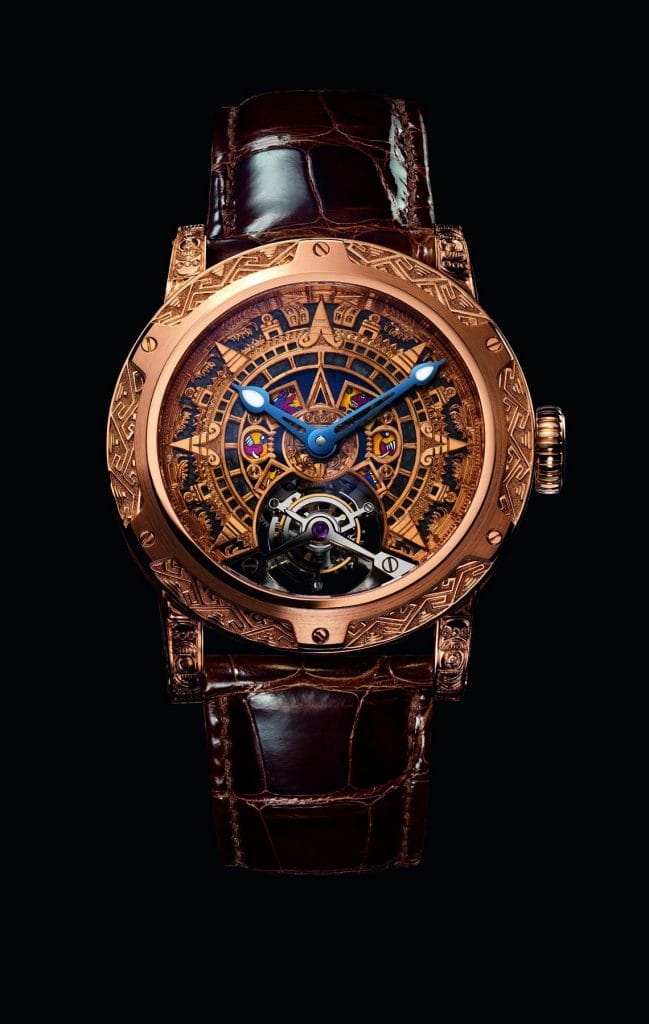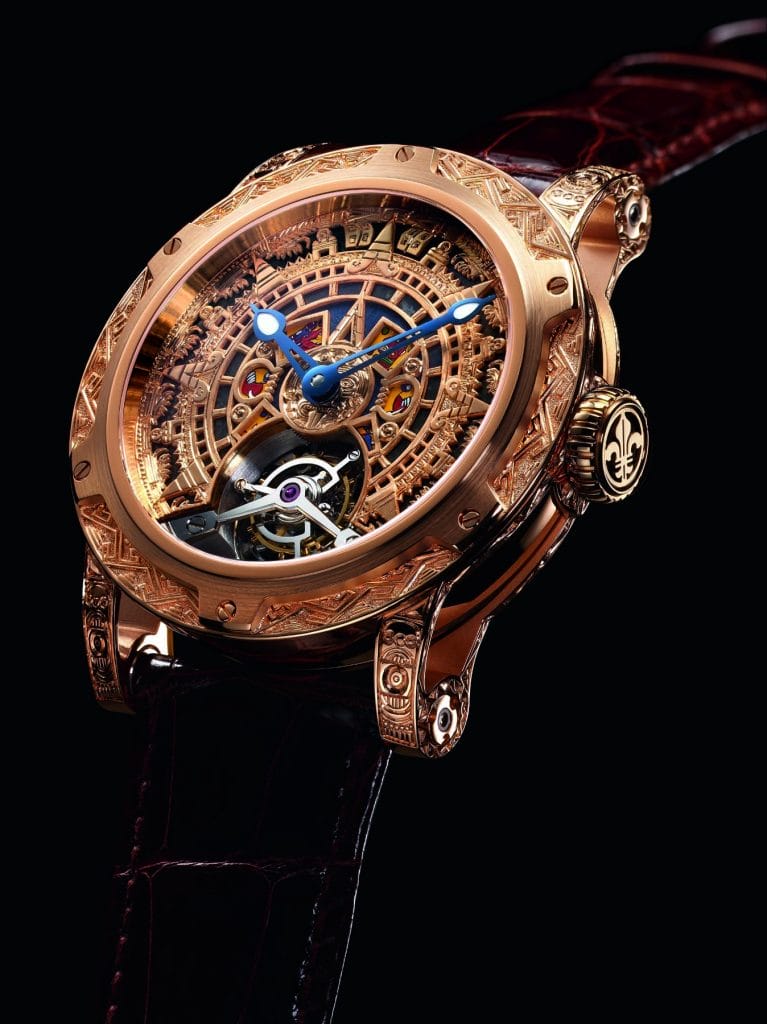 « Only Mexico » est équipé du tourbillon mécanique Louis Moinet. Médaille d’Or du dernier Concours International de Chronométrie, il bat à 21,600 vibrations par heure.