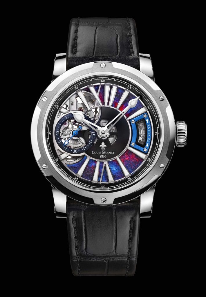 Le cadran de Skylink dépeint cette immensité cosmique. Un procédé graphique, exclusif à Louis Moinet, permet de créer des couleurs qui rappellent une nébuleuse, cet amas de gaz et de poussières interstellaires riche de multiples variations chromatiques. Cette composition est survolée des deux aiguilles « Goutte de rosée » propres à Louis Moinet. Les index tridimensionnels surélevés qui s’étirent sur ce cadran donnent une profondeur réelle à la pièce, un côté architectural renforce leur finition très particulière. Leur flanc présente une partie diamantée et satinée, afin d’amener l’éclat le plus profondément dans le cadran et donner une étincelle de vie à la pièce. Le contraste de couleurs est accentué par la laque posée sur chaque index. Les secondes s’égrènent sur leur compteur de 9 heures dont la fine pellicule métallisée donne une variation de couleur à la lumière, allant du bleu nuit au violacé.