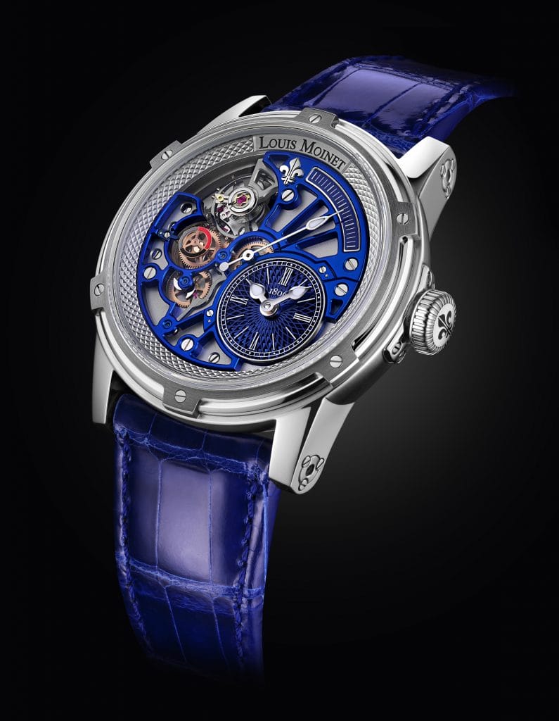 Ensuite, la pièce est équipée d’une nouvelle boîte. Elle est issue de la collection Memoris de Louis Moinet, le premier chronographe-montre de l’histoire. Riche de 52 composants, cette boîte a été passée de 46 mm à 44 mm puis entièrement retravaillée pour accueillir le mouvement rétrograde du Tempograph 20-Secondes. C’est également la première fois, pour la version bleue, que cette boîte de prestige est réalisée en acier.