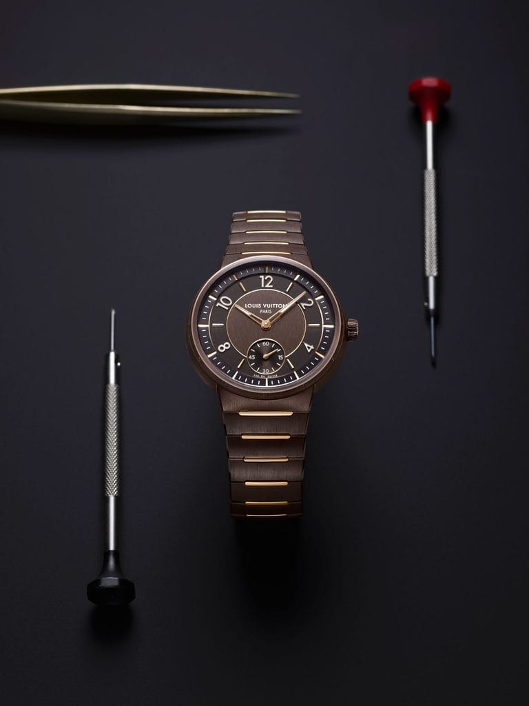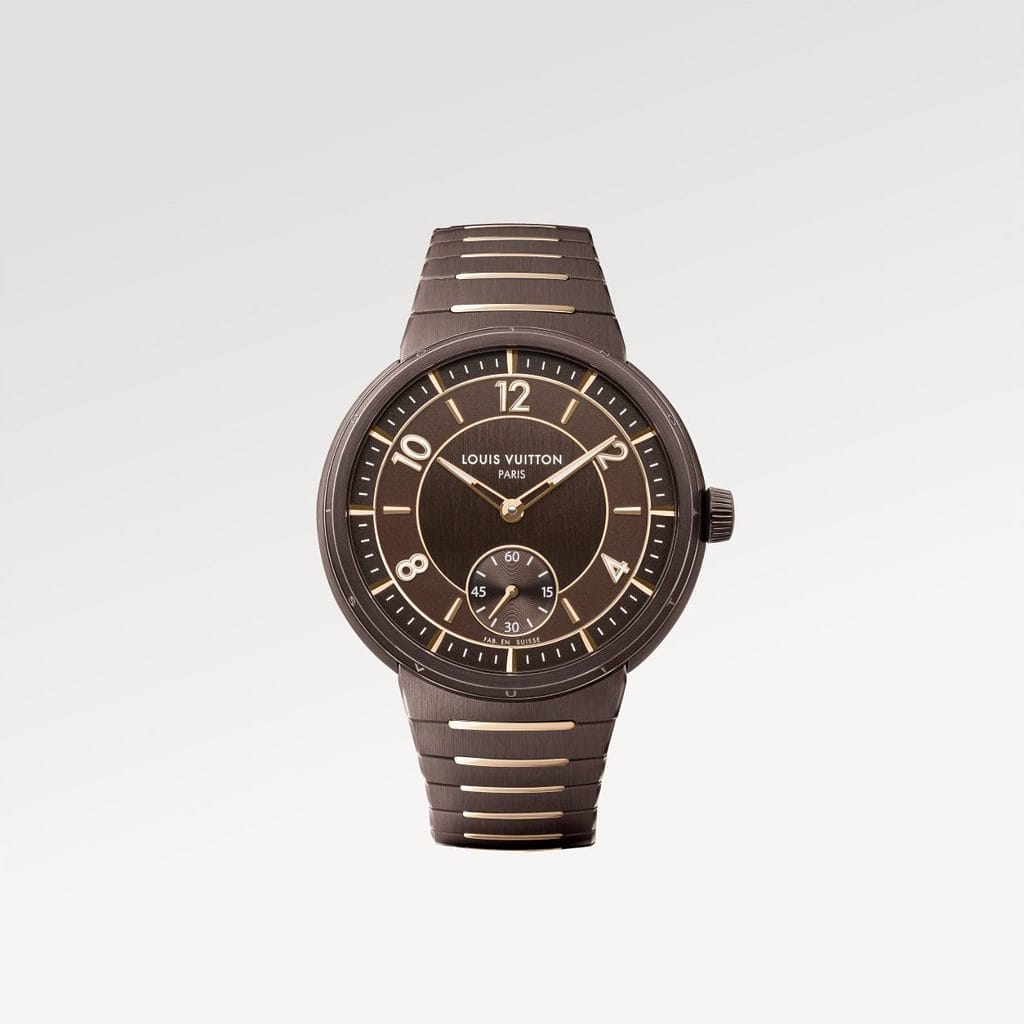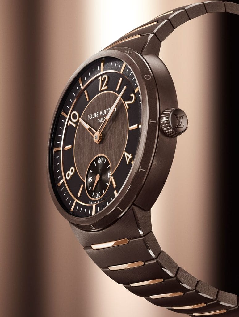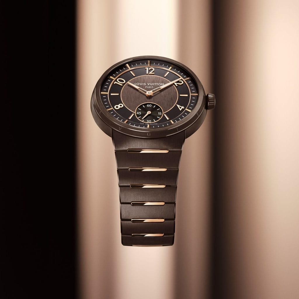 Cette nouvelle version en céramique puise son inspiration dans la teinte historique des malles Louis Vuitton. Utilisée sur les cadrans Tambour depuis 2002, cette nuance brune confère à la montre une allure sophistiquée et décontractée. L’association de la céramique et de l’or rose renforce son élégance intemporelle tout en garantissant une robustesse exceptionnelle.