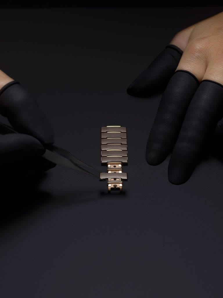 Le bracelet intégré, conçu pour conserver ses lignes fluides et son ergonomie, s’adapte parfaitement au poignet. Chaque maillon arrondi est façonné avec soin, s’affinant progressivement vers la boucle déployante pour un ajustement parfait. Les surfaces brossées contrastent avec les chanfreins polis, mettant en valeur l’expertise des maîtres artisans. 80 % du temps de fabrication du bracelet est dédié aux finitions manuelles.