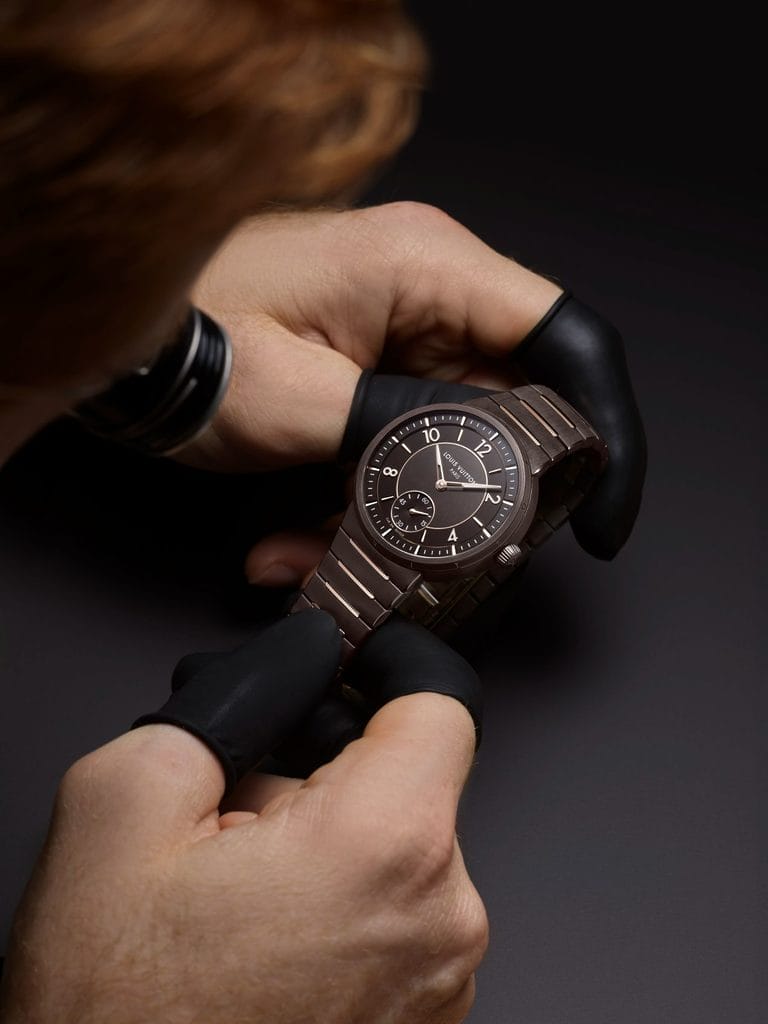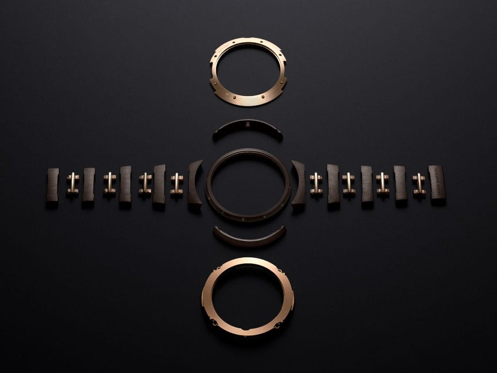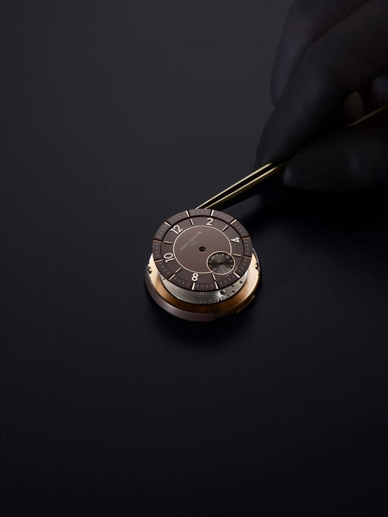 Fabriquée en oxyde de zirconium (ZrO2), la céramique se distingue par sa durabilité, sa légèreté, sa résistance aux rayures et son toucher soyeux. Disponible dans une palette variée de couleurs, elle offre un éclat et une profondeur inégalés. Si les teintes noires ou blanches sont déjà un défi technique, obtenir une céramique brune requiert une expertise encore plus poussée. Pour atteindre la nuance souhaitée, La Fabrique du Temps Louis Vuitton a mis au point un processus complexe nécessitant l’intervention d’artisans hautement qualifiés.