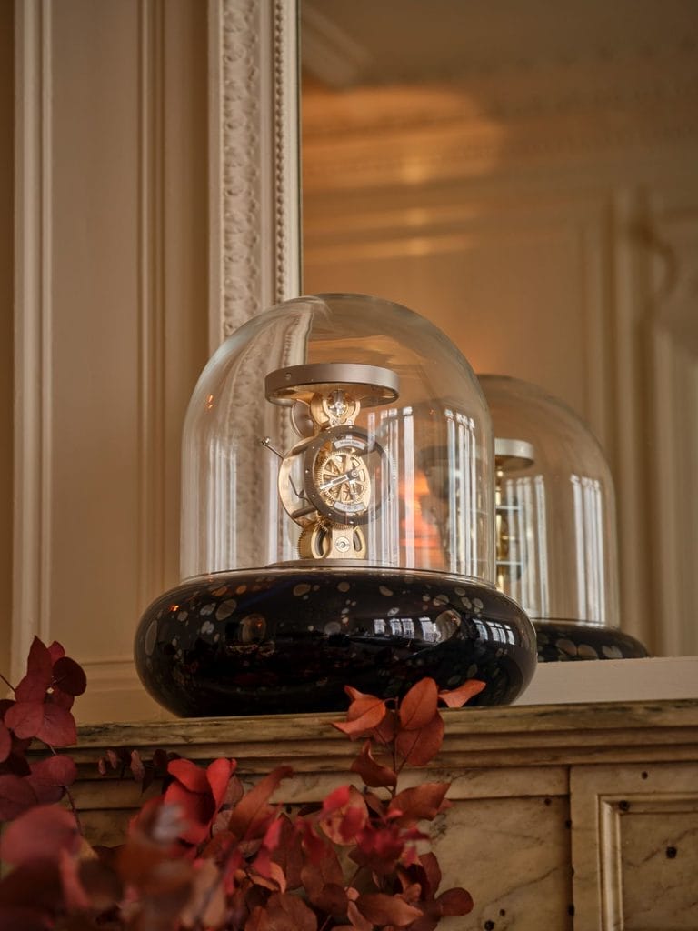 Persée Or se distingue par des détails minutieux, fruits de la collaboration avec des experts reconnus comme le Meilleur Ouvrier de France Thierry Ducret. Les matériaux nobles, notamment le laiton horloger, les rubis et les finitions en or rose 24 carats, confèrent à cette pendulette un caractère exceptionnel. Avec une réserve de marche de deux semaines et une sonnerie réglable, elle peut être positionnée selon les préférences de son propriétaire, ajoutant une flexibilité fonctionnelle à son élégance intemporelle.