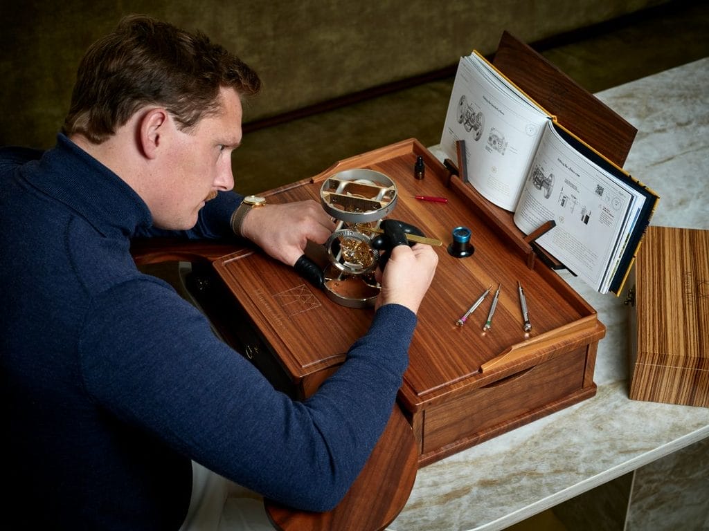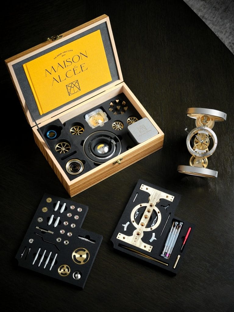 Livrée dans un coffret en bois Zebrano, chaque pendulette est accompagnée des 233 composants nécessaires à son assemblage, ainsi que d’outils spécialement conçus pour les non-initiés. Un livre d’environ 150 pages guide l’assemblage, transformant cette expérience en un voyage pédagogique enrichissant.