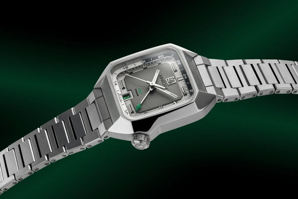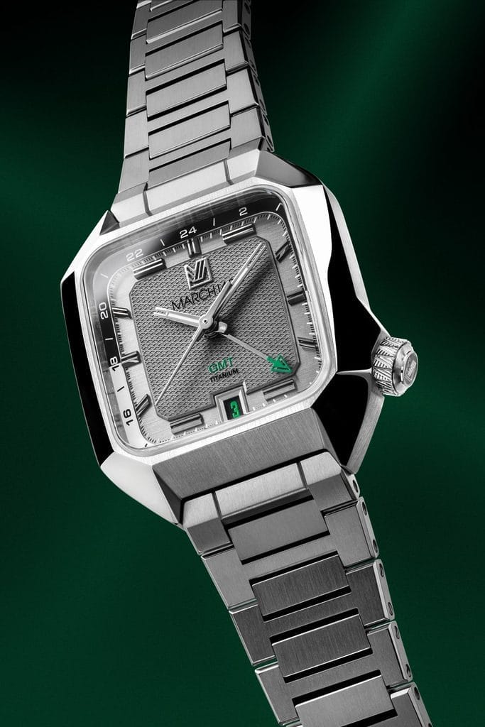 Son poids total est de 82 grammes, équipée d’un bracelet en titane intégré, soit 48 grammes de moins qu’une version standard en acier. Son cadran à trois niveaux présente un centre gris texturé, entouré d’un réhaut aux traits tirés et d’une lunette 24H bicolore, blanche pour le jour et noire pour la nuit. L’aiguille GMT verte perforée reprend les codes signatures de la maison, illustrant simplicité, efficacité et unicité.