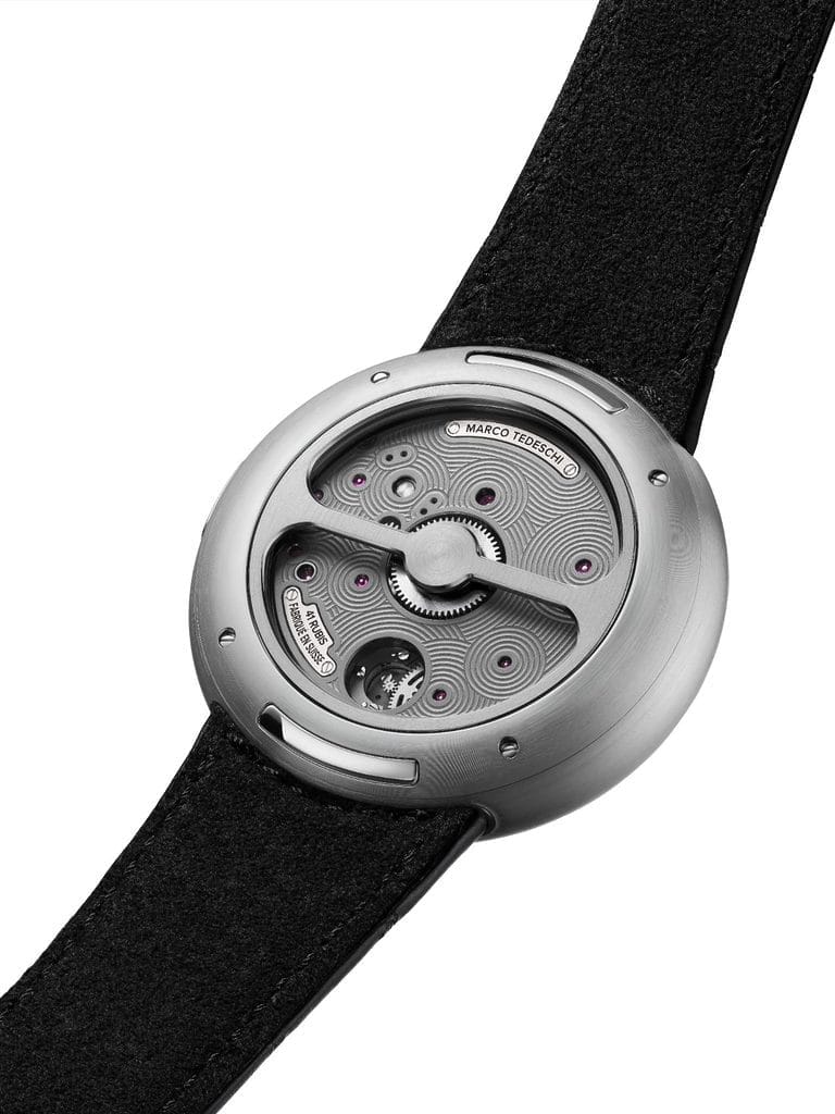 Fidèle à sa philosophie, Marco Tedeschi privilégie une approche minimaliste et fonctionnelle : chaque élément est réduit à son expression la plus essentielle. La performance et la précision coexistent sans compromis, au service exclusif du mouvement. L’esthétique, elle, découle naturellement de cette recherche d’équilibre. Moins de composants, moins de complexité, mais davantage d’efficacité et de fiabilité.