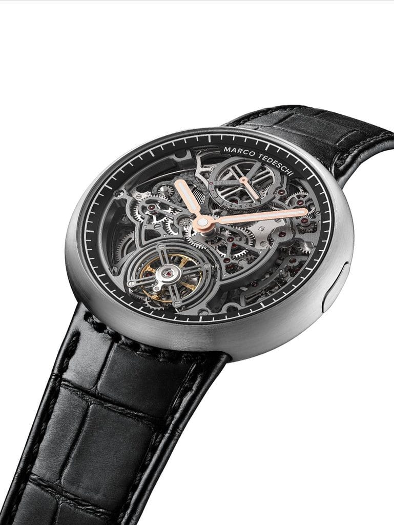Dès l’origine, avec le Tourbillon Central (MTO), Marco Tedeschi a tracé une feuille de route ambitieuse : développer une constellation de douze complications supplémentaires, chacune repensée selon un principe fondamental qui lui est cher : la forme suit le mouvement.