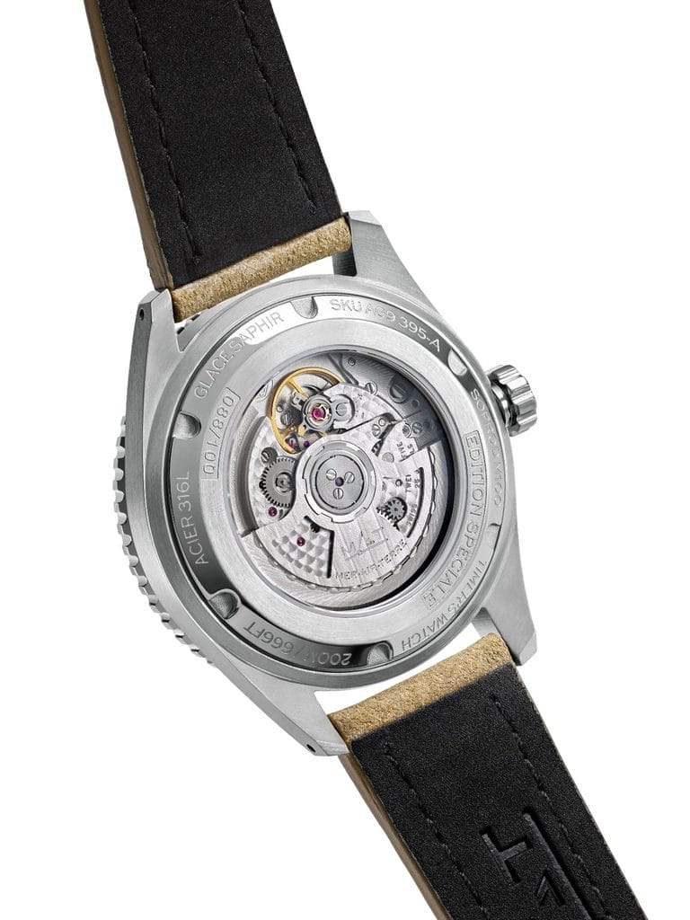 Sous sa silhouette maîtrisée, la Picobello Blue cache une construction robuste. Le boîtier en acier inoxydable de 39,5 mm garantit une étanchéité à 200 mètres, adaptée aux environnements marins exigeants. Animée par un mouvement mécanique automatique suisse Soprod M100, elle offre la fiabilité attendue par les connaisseurs, visible à travers un fond transparent protégé par un verre saphir.