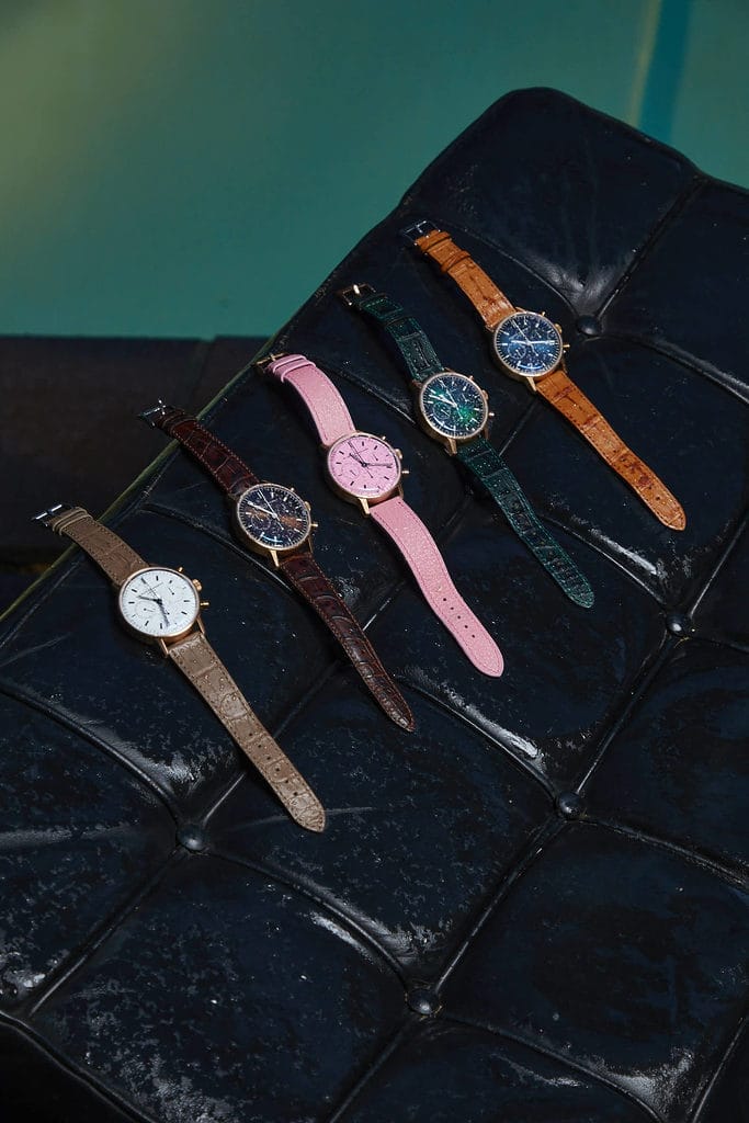 Le parcours de chaque chronographe L3 Gold Edition implique une attention méticuleuse aux détails. Depuis le moulage individuel, le meulage précis et le polissage à la main des boîtiers en or jusqu’à la personnalisation des poussoirs en or massif et la production de cadrans minimalistes très originaux : chaque étape incarne l’engagement de Maurice de Mauriac en faveur de l’excellence. Chacun des cinq garde-temps a reçu le poinçon officiel du contrôle des métaux précieux de Bienne, un autre témoignage de la qualité exceptionnelle de la marque et de son engagement envers le label Swiss Made. Deux mouvements différents de Concepto, affinés sur mesure, sont disponibles, selon les préférences de l’acheteur.