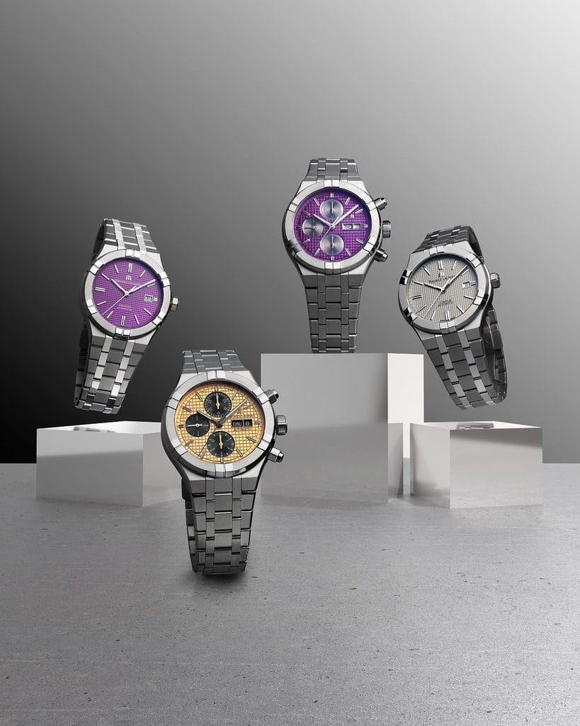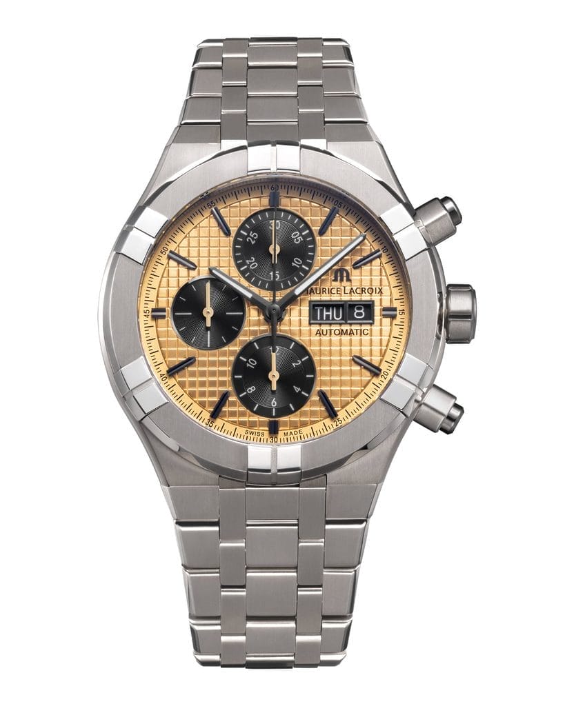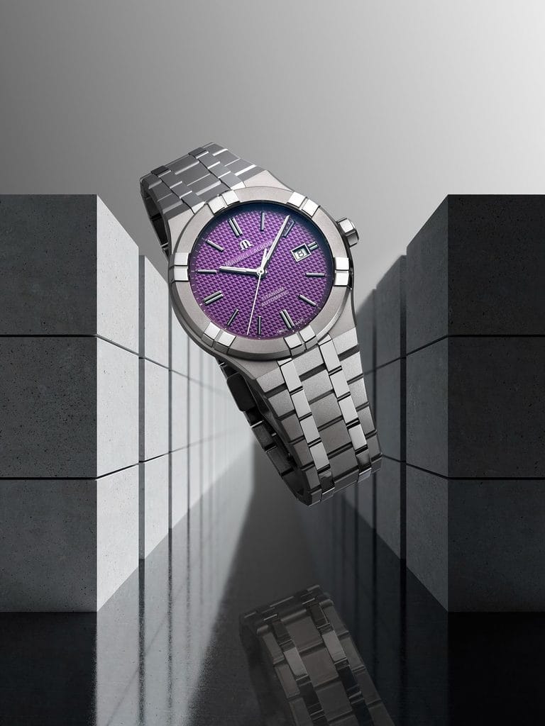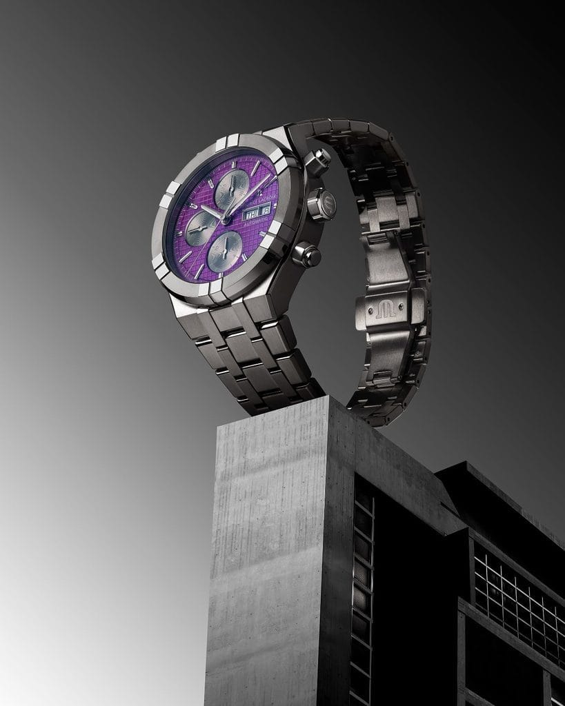 Pour ceux qui évoluent dans un cadre urbain où la vie trépidante exige une gestion minutieuse du temps, Maurice Lacroix dévoile aujourd’hui deux nouvelles déclinaisons de l’AIKON Automatic Chronograph. Ces modèles se distinguent par leurs cadrans sophistiqués, ornés d’un motif effet maille, d’une finition luminescente, d’un affichage du jour et de la date et de trois compteurs subtilement intégrés. Fonctionnelle, l’AIKON Automatic Chronograph est disponible en deux nuances de cadrans : un violet profond rehaussé de compteurs argentés, et une version dorée avec des compteurs noirs. À l’instar de l’AIKON Automatic, le boîtier de l’AIKON Automatic Chronograph est sublimé par des détails en titane Grade 5, qui lui confèrent une brillance éclatante et hautement polie. Maurice Lacroix a harmonieusement marié des surfaces brossées et polies, créant ainsi un contraste subtil et raffiné qui sublime chaque détail de la montre.