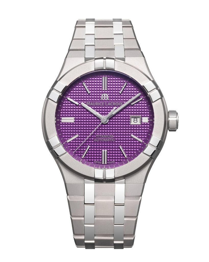 L’AIKON Automatic se décline en deux versions distinctes, toutes deux dotées d’un cadran orné d’un motif clous-de-Paris, d’aiguilles des heures et des minutes facettées revêtues de Super-LumiNova pour une lisibilité optimale dans l’obscurité, d’une aiguille centrale des secondes et d’un guichet indiquant la date. Un élégant cadran gris offre une esthétique monochrome, soulignant les nuances froides du boîtier en titane. L’AIKON Automatic se décline également dans une teinte de cadran violet vif pour ceux qui souhaitent se démarquer audacieusement.