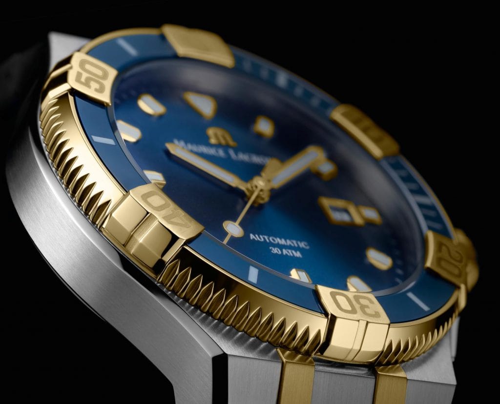 Autre première avec l’AIKON Venturer de 43 mm qui s’habille d’acier et d’or, plus exactement de composants en acier dont la surface est dorée à l’or jaune 2N. Petits maillons du bracelet, couronne, cavaliers de la lunette, des touches chaudes et précieuses donnent une nouvelle destination à ce qui était jusque-là un modèle fonctionnel. Mais la fonction de cette version est tout autre : un cadran bleu profond soleillé relayé par une lunette en céramique de même teinte lui confère une allure habillée, sport chic, qui correspond à la réalité des usages d’une montre entièrement métallique. Le choix de l’or jaune 2N et d’un bleu abyssal donne une touche premium vintage années 80 à l’ensemble, enrichissant à nouveau le vocabulaire de style Maurice Lacroix. A nouveau, le système de changement de bracelet Easychange permet à son détenteur de varier les styles en une fraction de seconde. Également équipé du mouvement automatique ML 115, ce modèle rentre dans la collection courante de la marque.