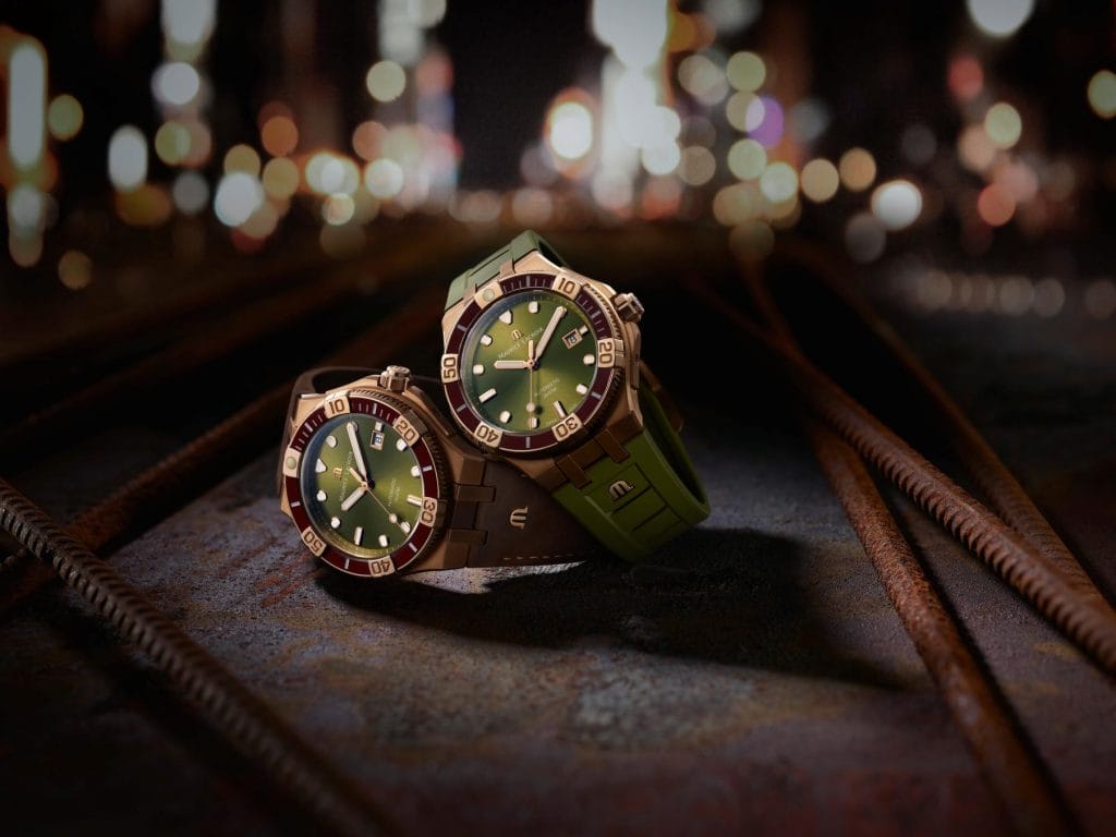 Pour la première fois, l’AIKON Venturer accède au bronze. Le boîtier de 43 mm est taillé dans un alliage spécial, capable de se patiner et de brunir sans s’oxyder. Pour prolonger la vocation fonctionnelle de ce métal, quasi-synonyme de tool watch et donc parfaitement adapté à la Venturer, Maurice Lacroix l’a complété avec un cadran soleillé vert profond. Cette couleur habille également le bracelet en caoutchouc parcouru de rainures qui le structurent. Grâce au système Easychange, celui-ci peut être échangé en un clin d’œil avec une version en cuir de veau marron vintage à surpiqûre écrue. La lunette en céramique prend une teinte marron, tandis que les cavaliers marqueurs horaires restent fidèles à la grammaire du style de Venturer et sont en bronze, comme la boîte. Cette montre munie du mouvement automatique ML 115 est disponible en édition limitée de 500 pièces.