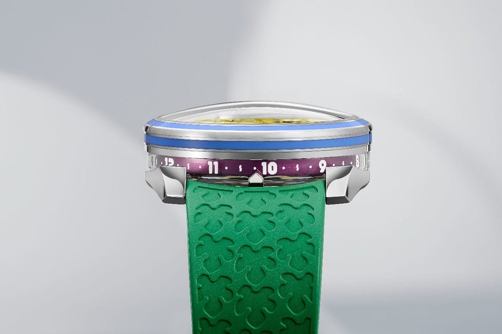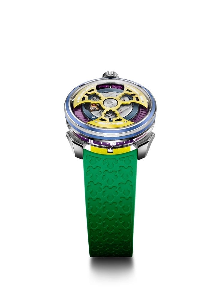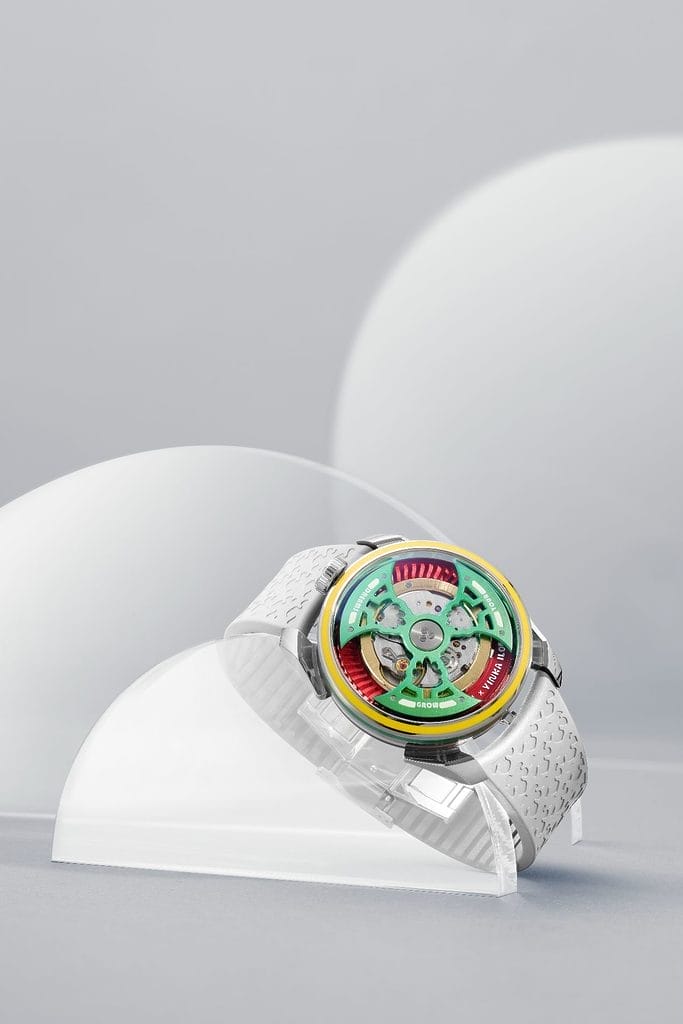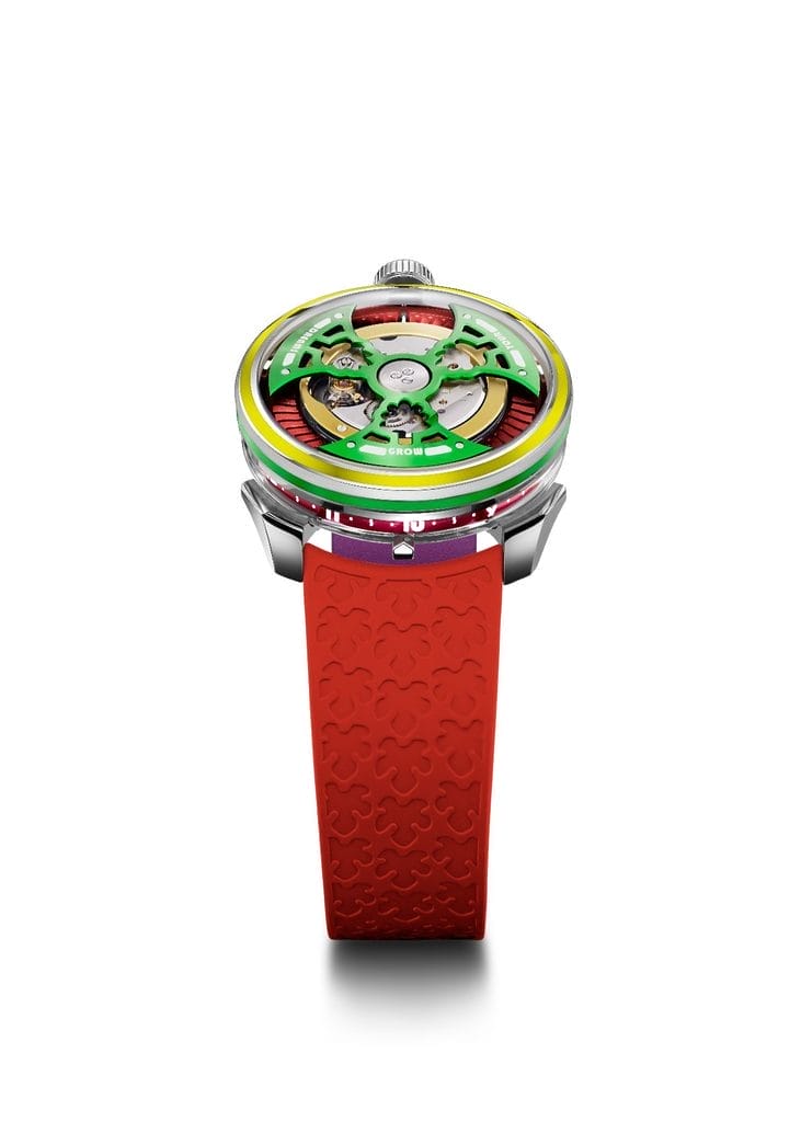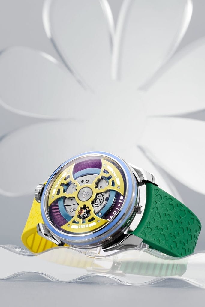 Si le boîtier et le mouvement s’appuient sur le calibre suisse déjà utilisé dans la M.A.D.1S, la série va plus loin en matière de design et de complexité technique. Le rotor, redessiné plus fin et plus élaboré, intègre le motif d’un arbre, symbole d’espérance et de développement. Réalisé en titane, il est coloré par anodisation en jaune, vert ou bleu, et illuminé par du Super-LumiNova qui met en valeur la devise gravée : « Grow Your Dreams ». Les chiffres des heures ont été dessinés par l’artiste lui-même.