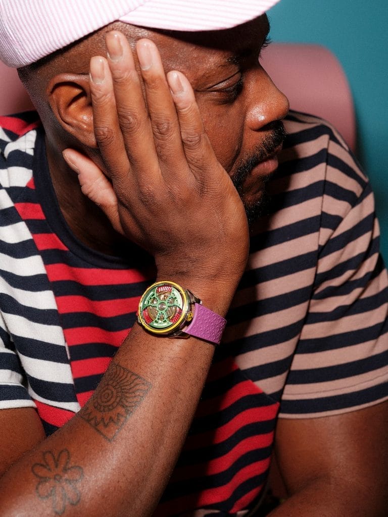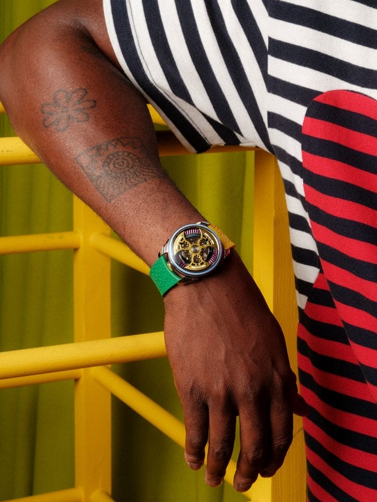 Yinka Ilori suit son propre chemin, rêvant toujours plus grand. C’est par hasard que Maximilian Büsser a découvert son travail en 2023, alors qu’il feuilletait des magazines durant ses vacances. Séduit, il a pris contact avec lui, et quelques jours plus tard, l’artiste était à Genève pour explorer l’univers de M.A.D.Editions et imaginer une nouvelle toile : la montre.
