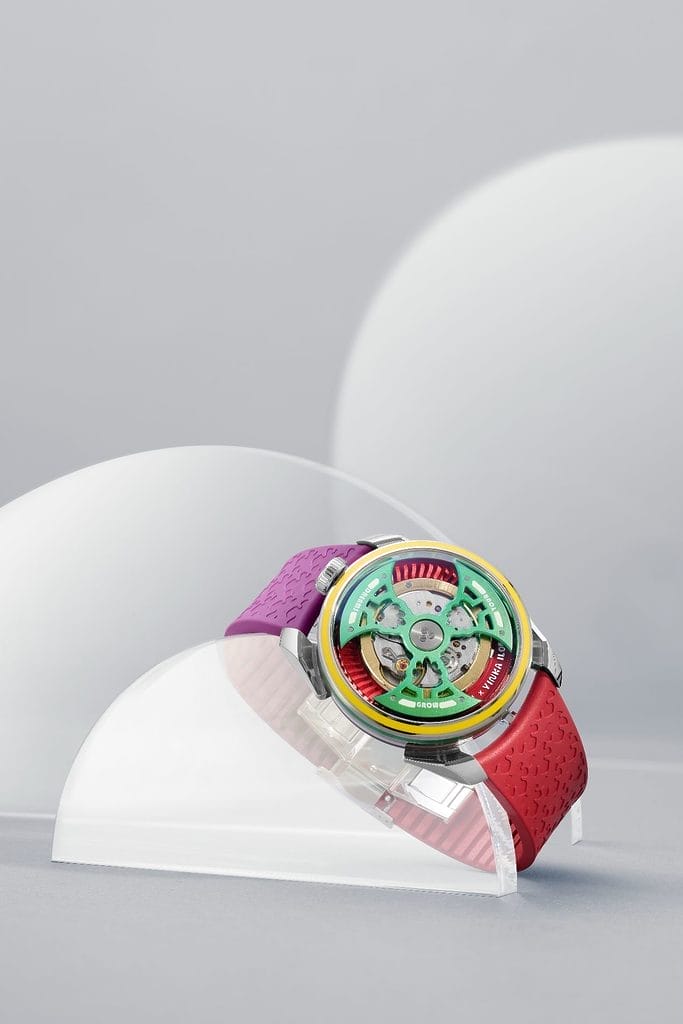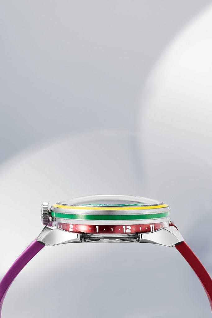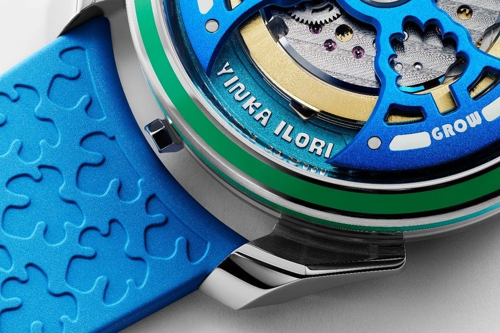 Pour respecter l’importance de la couleur dans l’œuvre de Yinka Ilori, trois modèles ont été imaginés au lieu d’un seul. Cette première collaboration horlogère a donné naissance à une série poétique baptisée « Grow Your Dreams », déclinée en trois éditions limitées à 400 pièces chacune : Sun, Nature et Water.