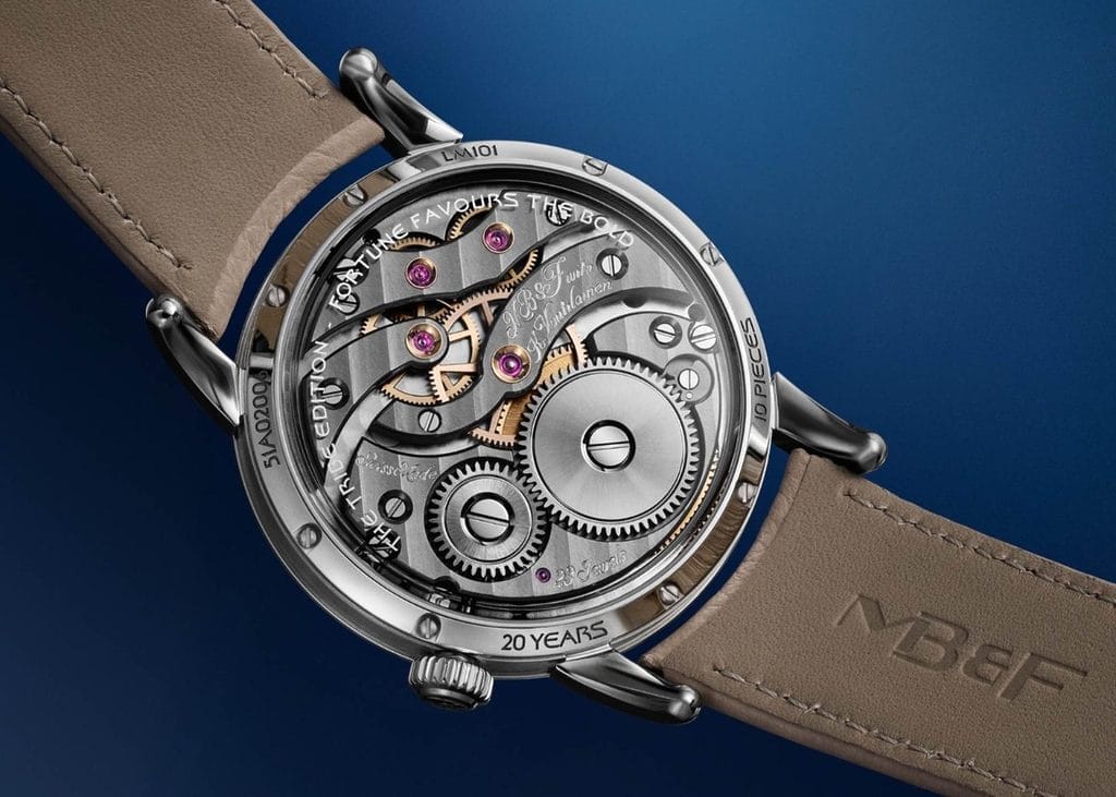 Cette édition reprend la même palette argent/noir/bleu que la LM101 Longhorn, et introduit pour la première fois chez M.A.D.Editions des chiffres romains sur le cylindre des heures et minutes, un clin d’œil à la tradition horlogère que MB&F aime revisiter. Le fond saphir, lui aussi gravé du message “Fortune Favours the Bold”, crée un pont symbolique entre les deux univers de la maison : celui de l’horlogerie conceptuelle et celui de l’horlogerie accessible.