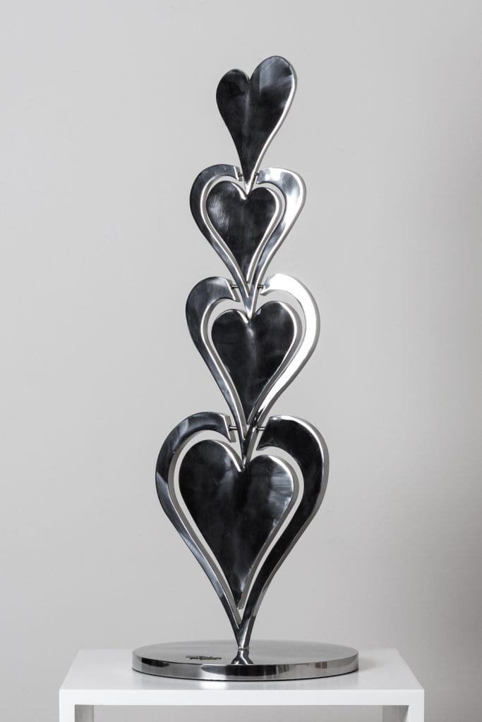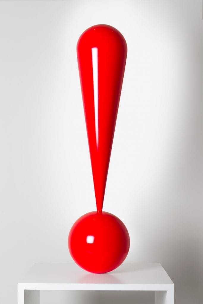 Une autre œuvre présentée à la M.A.D.Gallery s’intitule EXclamation. Il s’agit d’un point d’exclamation, penchant légèrement jusqu’à laisser croire qu’il va tomber pour de bon, avant de se redresser grâce à un système ingénieux de répartition du poids. On imagine aisément ces sculptures cinétiques évoluant en harmonie avec les arbres d’un jardin ou flottant au gré des vents sur un toit-terrasse. EXclamation mesure 80 cm de haut et est limitée à 33 exemplaires.
