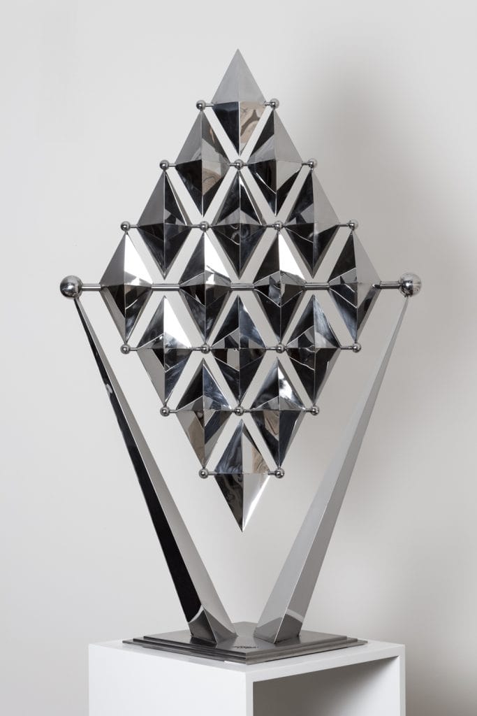 Grâce à son imagination hors pair et un don exceptionnel pour animer ses œuvres d’art, Ralfonso s’est imposé en maître de la sculpture cinétique. Ces talents uniques s’illustrent brillamment à travers KARO, qui tire son nom du mot allemand désignant la forme géométrique en diamant dite losange. Un regard plus attentif sur cette œuvre d’art, haute de 120 cm et fabriquée à dix exemplaires seulement, révèle 16 éléments en forme de diamant qui flottent librement et forment un losange encore plus grand. Un simple toucher de la main, une brise, si légère soit-elle, suffisent pour donner vie à ses lignes si nettes et éclatantes, le balancement de chaque losange d’arrière en avant créant différentes combinaisons de motifs à l’infini.