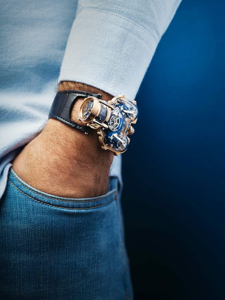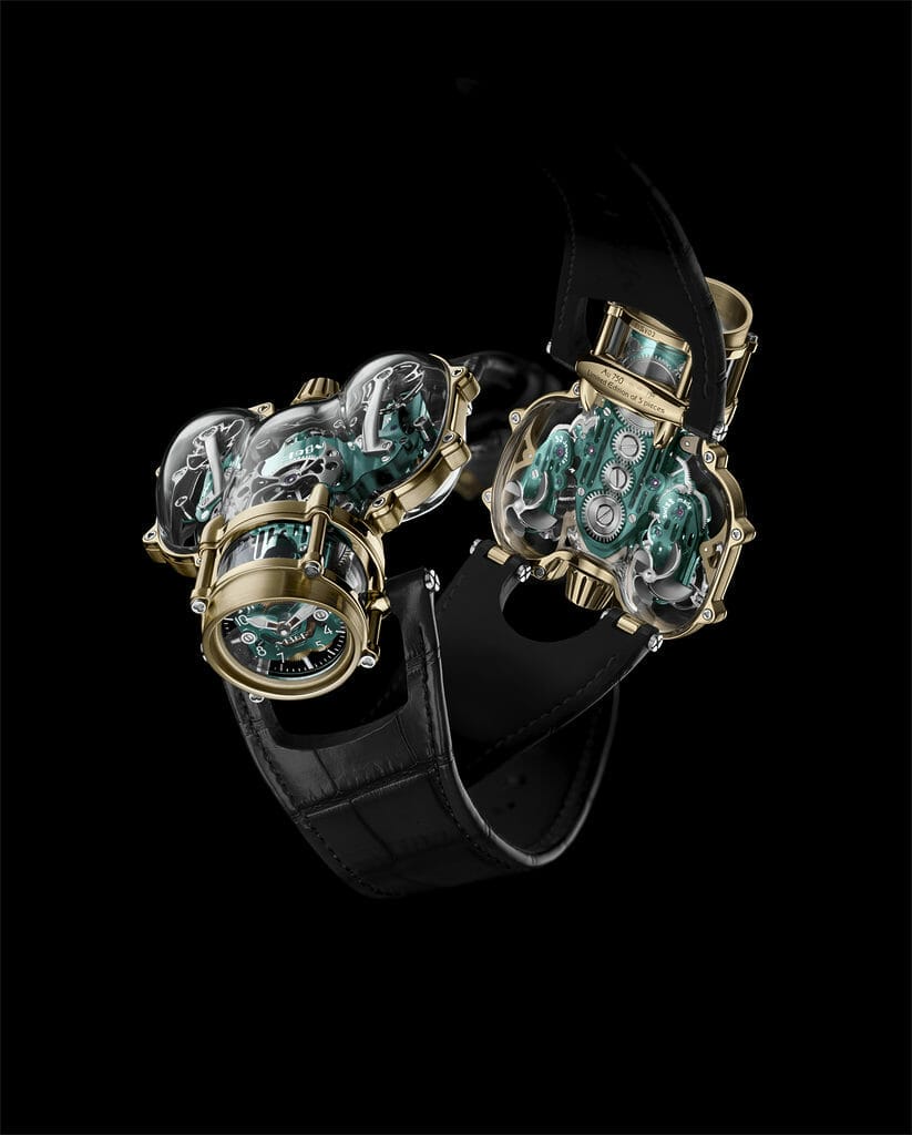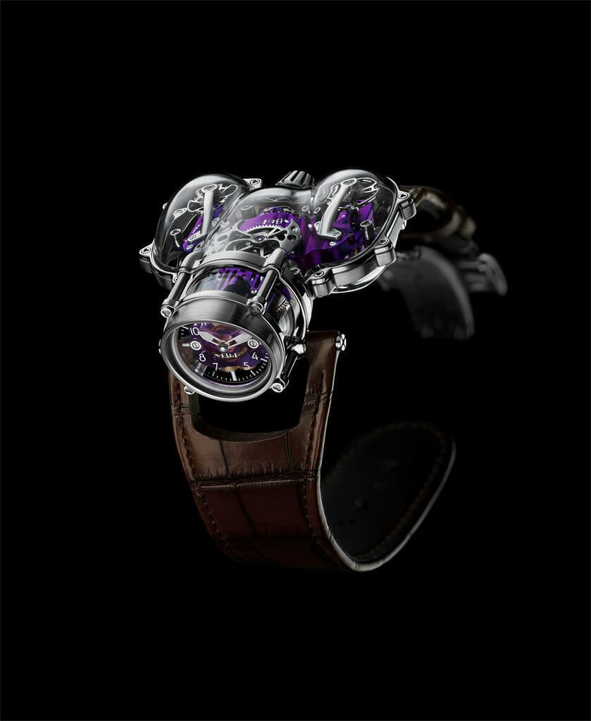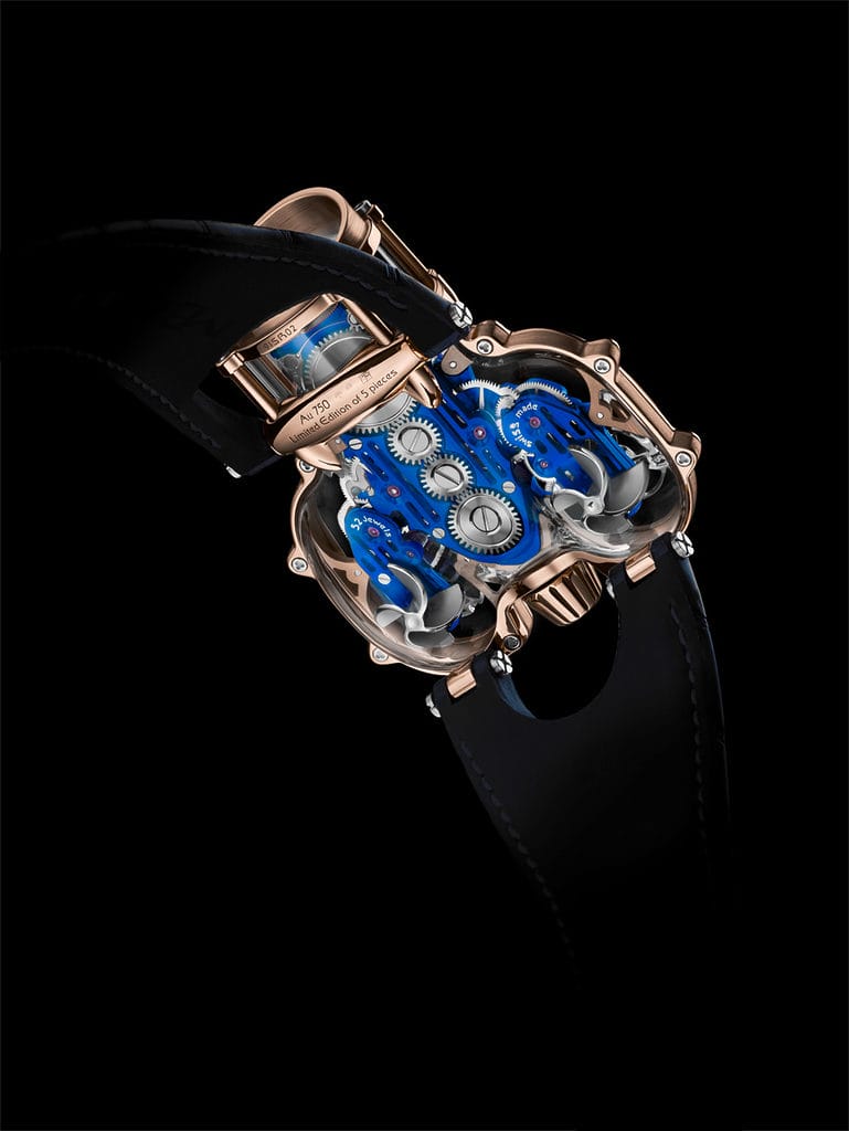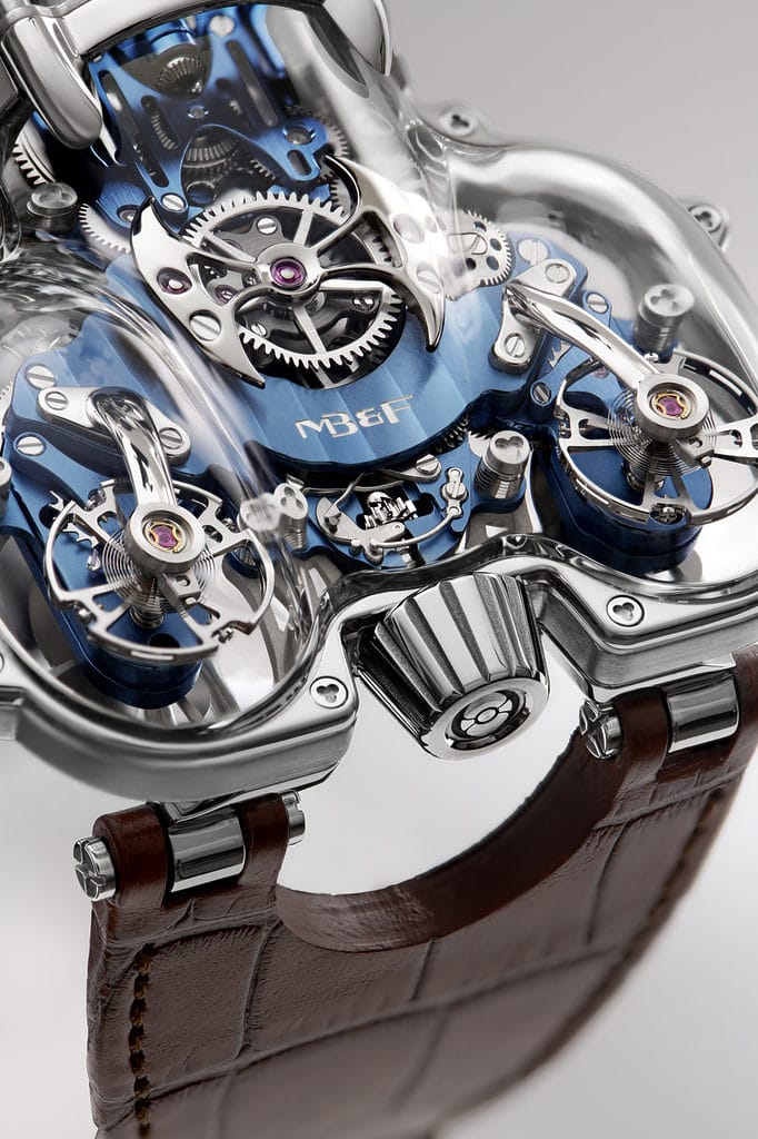 Parallèlement, le saphir s’avère extrêmement difficile à usiner dans des formes tridimensionnelles complexes, un défi amplifié par les faibles tolérances requises en horlogerie. Depuis ses toutes premières créations, MB&F expérimente des composants en verre saphir de plus en plus sophistiqués, avec pour principaux exemples la HM2 « Sapphire Vision », le verre doublement arqué de la HM4 « Thunderbolt », la récente HM3 FrogX et le corps hallucinant de la HM6 « Alien Nation ».