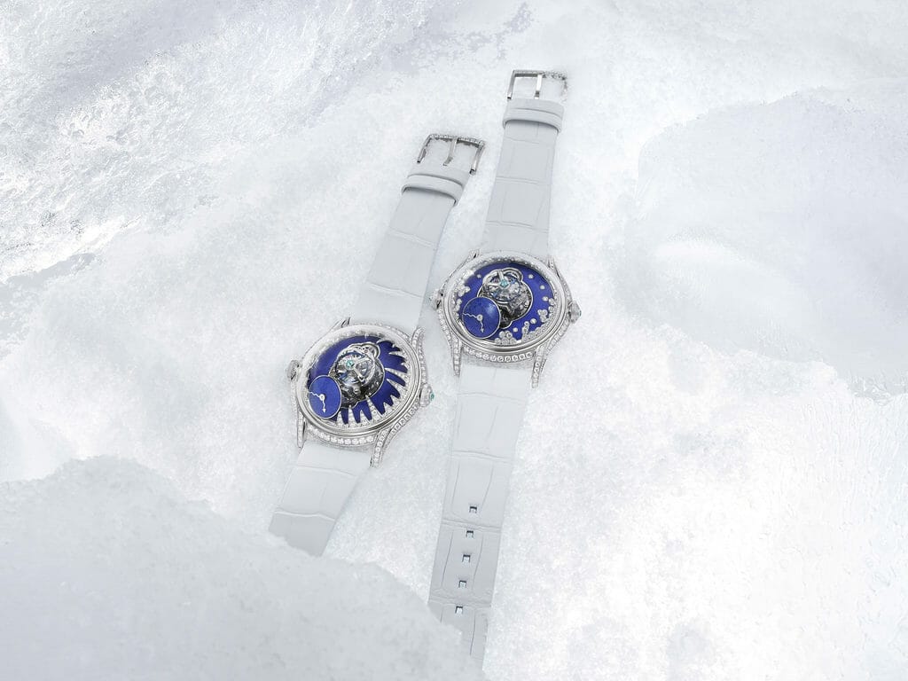 8 exemplaires « ICE » et 8 exemplaires « BLIZZARD » ; deux éditions en or blanc 18 carats avec boîtiers entièrement sertis de diamants et platines-cadrans en lapis-lazuli bleu mat.
