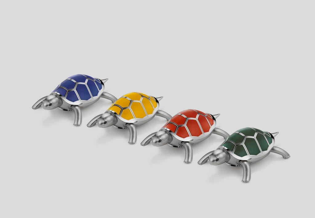 Nicolas Court et son équipe ont ajouté un système de sécurité à friction qui détecte les bords d’une surface et arrête immédiatement le mouvement de la tortue, avant le désastre. En outre, Ils ont repris un système de sécurité Reuge pour le mouvement de l’oiseau : si Chirp ou son couvercle sont accidentellement repoussés pendant le chant, l’oiseau s’arrête et se retire instantanément dans son nid.