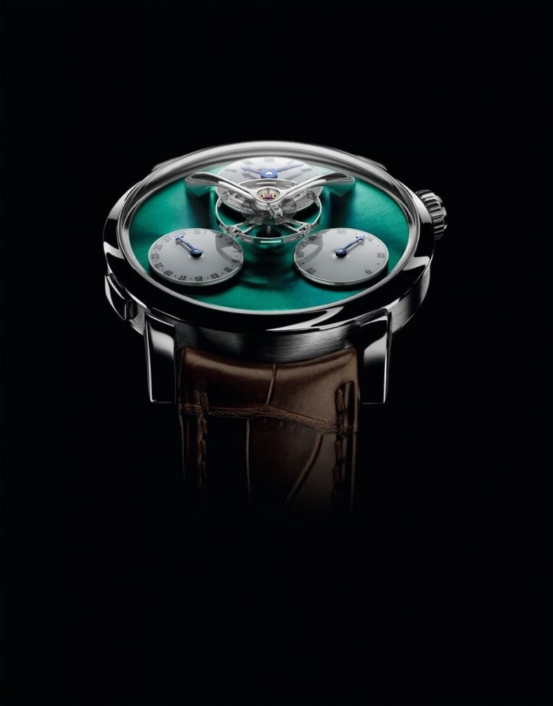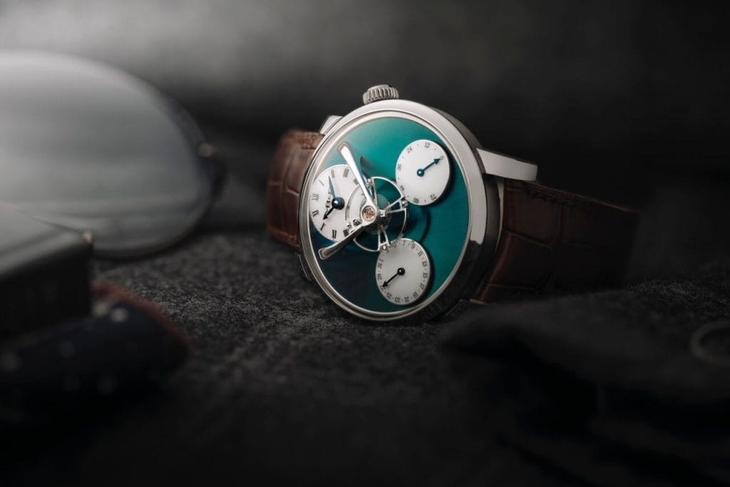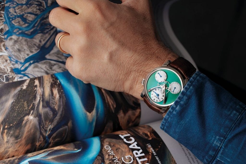 La nouvelle édition en titane grade 5 au cadran vert traité CVD se pare d’une finition soleillée spectaculaire, qui capte la lumière sous différents angles et fait osciller la couleur du cadran entre le bleu et le vert.