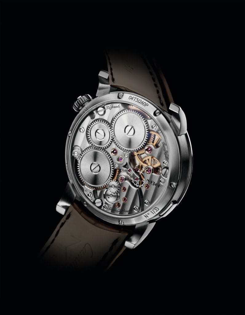 Sur les montres anciennes, la finition grenée était obtenue grâce à des bains d’acide. Pour produire un effet comparable, les méthodes actuelles impliquent un brunissage manuel à la brosse métallique. La LM Split Escapement fait honneur à la technique: elle est réalisée entièrement à la main sur chacune des 72 pièces de ces premières éditions.