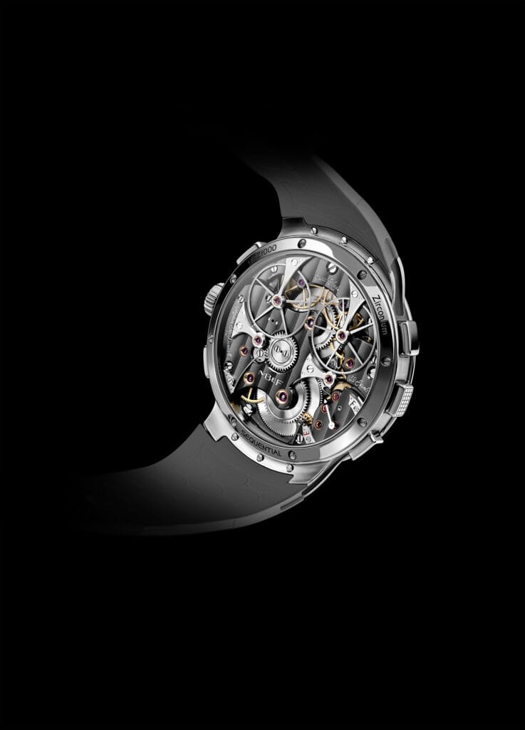 Comme dans l’édition de lancement de la LM Perpetual EVO, le zirconium est le premier matériau à constituer le boîtier de la LM Sequential EVO. Ce métal gris argenté, apprécié pour son éclat profond, est plus léger que l’acier et plus durable que le titane. Outre ces propriétés exceptionnelles, il est hypoallergénique et antimicrobien, ce qui le rend idéal pour une montre destinée à la vie active. Comme le zirconium s’enflamme spontanément quand il est sous forme de poudre, il peut être très dangereux de l’usiner, sauf dans des environnements strictement contrôlés, d’où sa rareté dans le monde de l’horlogerie.