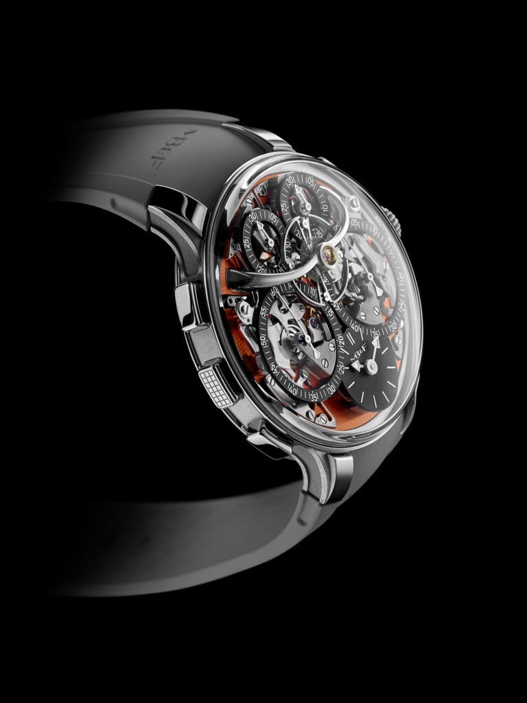 Double chronographe entièrement intégré, développé par Stephen McDonnell pour MB&F, commutateur Twinverter permettant plusieurs modes de chronométrage.