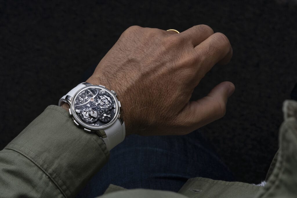 La plupart des autres chronographes sophistiqués, conçus pour des utilisations supplémentaires, disposent de mécanismes adaptés à des situations très spécifiques, axées sur le sport. En revanche, la LM Sequential EVO se prête à toutes les activités de la vie quotidienne, dans des contextes familiers à tout un chacun. Le boîtier en zirconium, l’étanchéité à 80 mètres et le système d’amortissement interne FlexRing confèrent une résistance sans précédent à des mouvements d’une telle complexité. Tout cela fait de la collection EVO une famille naturelle pour accueillir le premier chronographe de MB&F, lequel renforce l’identité définie lors de la création du premier modèle, la LM Perpetual EVO, en 2020 : « pas une montre pour le sport, une montre pour la vie ».