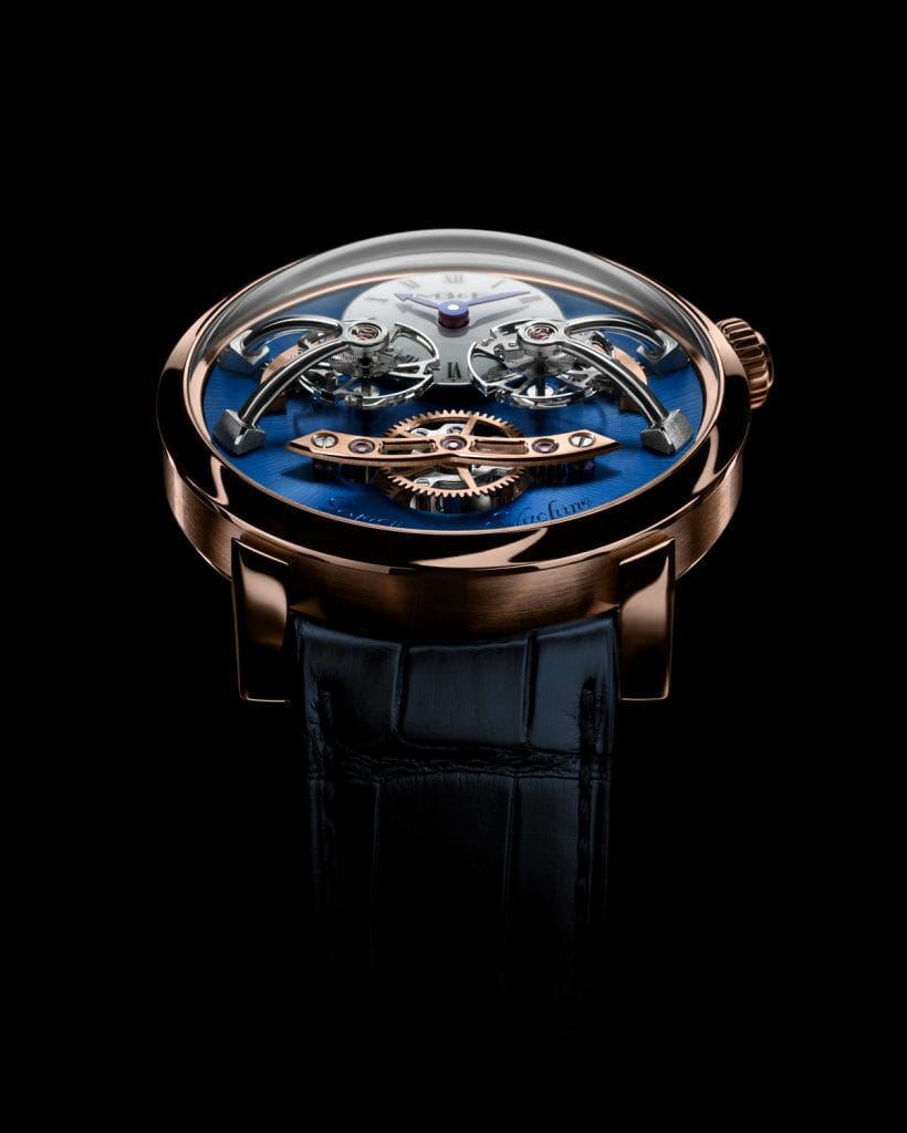 Sous un dôme en saphir bombé, le cadran de la Legacy Machine N°2, dont la base est en réalité la platine supérieure délicatement décorée du mouvement, est une illustration parfaite de la symétrie. De haut en bas : l’équilibre entre le petit cadran en laque tendue blanche rehaussé d’aiguilles en or bleui, à 12 heures, et le grand différentiel surélevé, à 6 heures. De gauche à droite : l’effet miroir des deux balanciers flottants et de leurs échappements qui se prolonge jusqu’à la position des porte-pitons des spiraux.