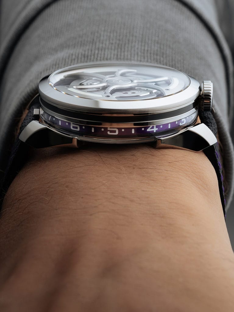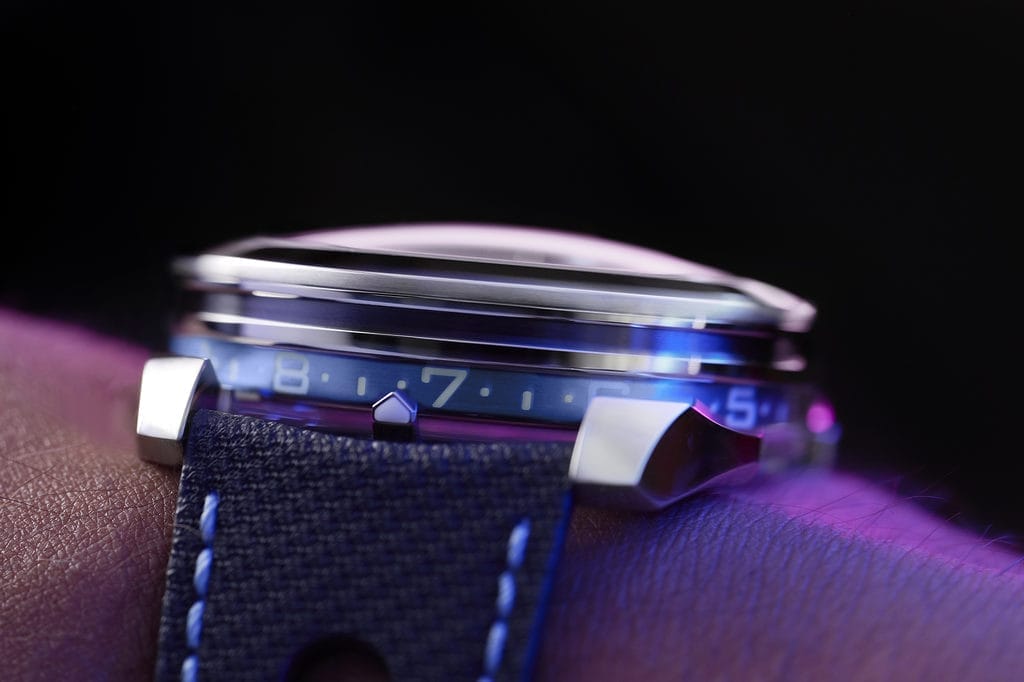 Alors que l’on compte environ 6’000 propriétaires d’une M.A.D.Edition à ce jour, la M.A.D.1S s’adresse à la prochaine communauté de collectionneurs et amateurs éclairés avec un profil plus aérodynamique, en partie grâce au nouveau mouvement Swiss made. L’épaisseur réduite de 15 mm – 20 % de moins que les précédentes M.A.D.1 – provient en outre de l’affichage par un seul cylindre (les éditions précédentes en comportaient deux, un pour les heures, un pour les minutes).