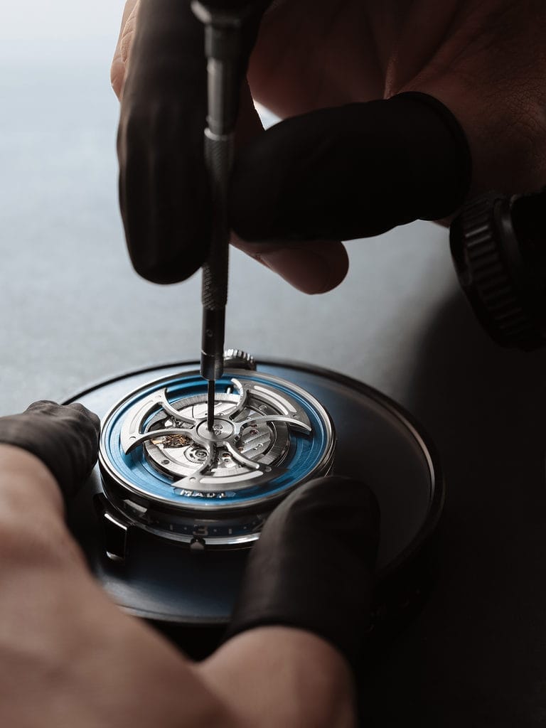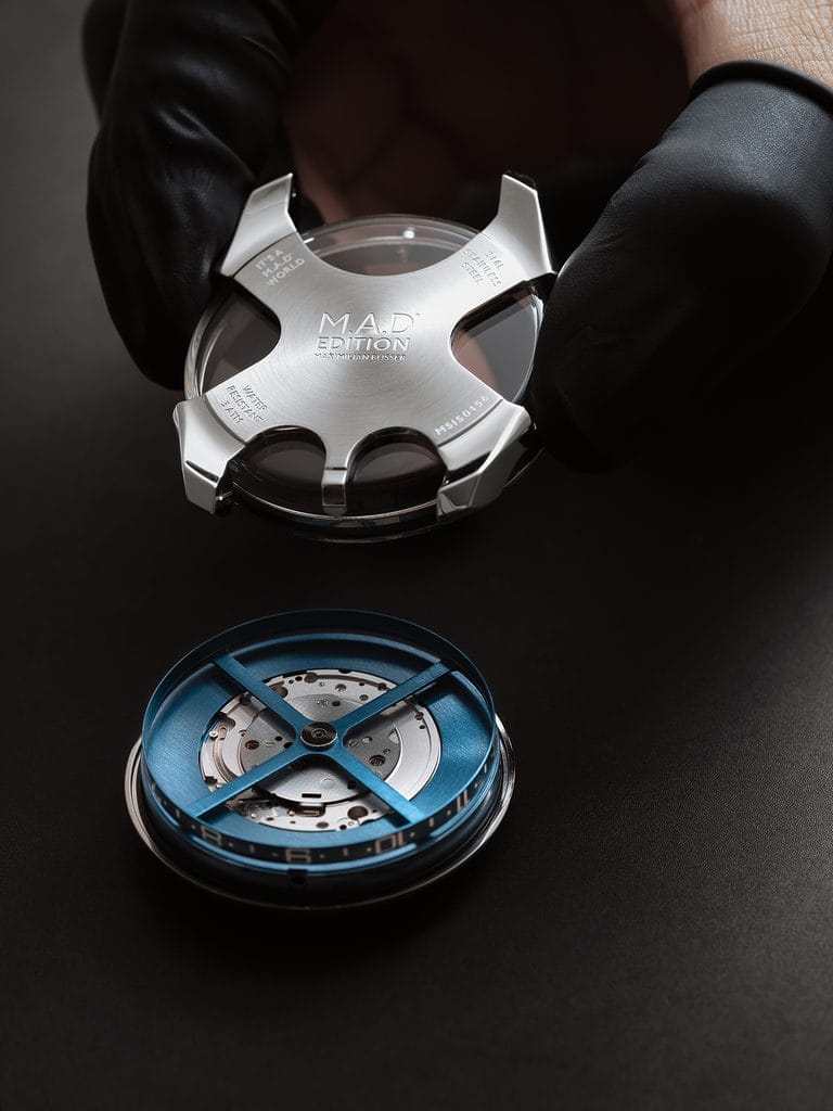 On ne pouvait produire aucun mouvement maison au prix souhaité. L’équipe a recherché partout un mouvement qui pourrait représenter l’esprit de la M.A.D.1 : en point de mire, un rotor à rotation rapide sous l’impulsion du poignet. À l’époque de la création de la M.A.D.1, alors que les mouvements bidirectionnels (rotations plus lentes à la clé ») étaient légion, on ne trouvait pas de mouvement à remontage unidirectionnel Swiss made dans la fourchette de prix souhaitée. Mais où serait la folie si l’on n’avait pas de rotations effrénées ? Aussi, Max Büsser et son équipe ont choisi de créer les révolutions magiques en modifiant un mouvement japonais fiable, le Miyota 821A, pour le doter du remontage unidirectionnel nécessaire à la réalisation du spectacle.