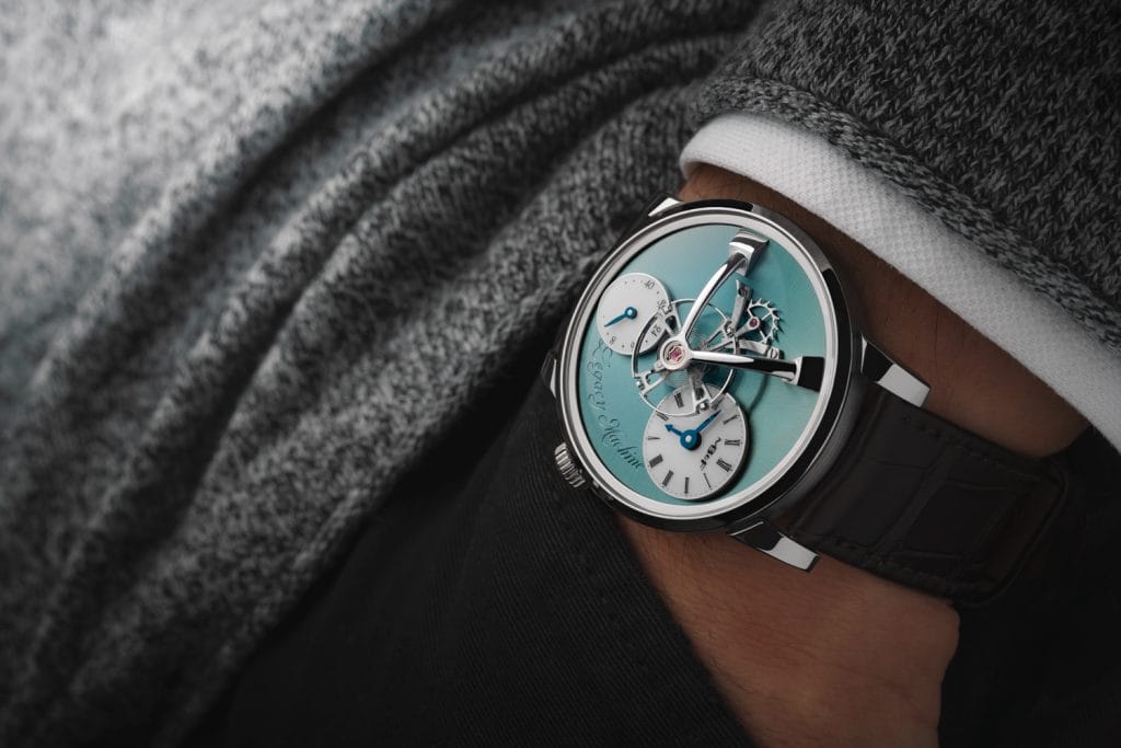 Cadrans et indications : Alors que le balancier suspendu animé domine la LM101, les cadrans blancs immaculés de l’heure (heures et minutes) et de la réserve de marche sont tous deux esthétiquement attirants et très lisibles grâce au fort contraste des aiguilles bleues.