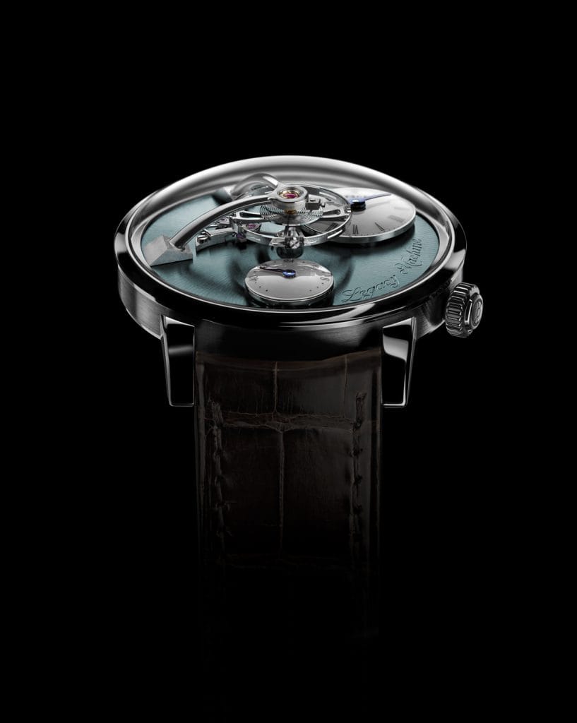 Legacy Machine 101 (LM101) a été lancée en 2014 et abrite le tout premier mouvement entièrement développé en interne par MB&F – ce qui a lancé une longue série de mouvements développés en interne. Le dernier né de la série – l’édition LM101 Palladium – est également la première pièce MB&F en palladium, un métal rare blanc argenté. La couleur naturellement blanche du palladium contraste avec un nouveau cadran soleillé, qui varie du gris au bleu pâle en passant par le vert selon la lumière.