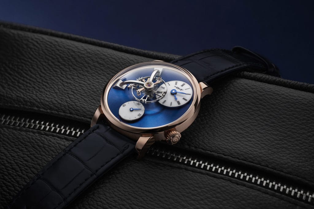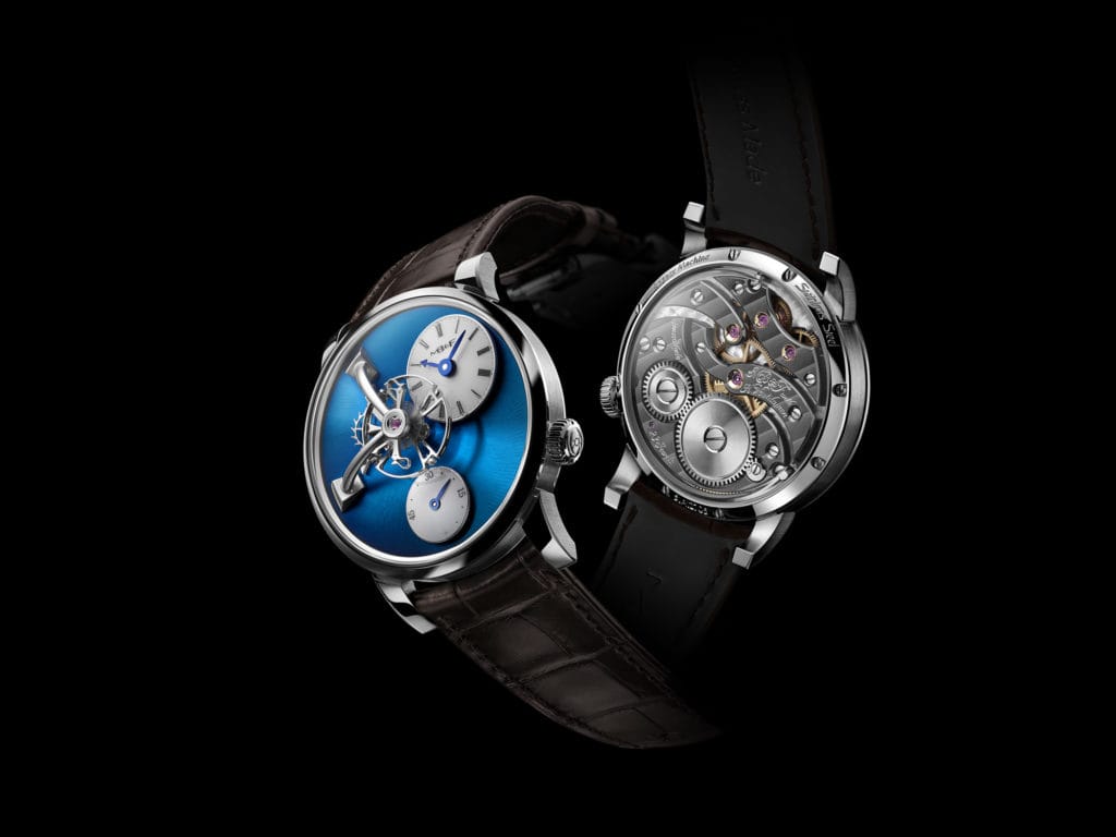 Cadrans et indications : Alors que le balancier suspendu animé domine la LM101, les cadrans blancs immaculés de l’heure (heures et minutes) et de la réserve de marche sont tous deux esthétiquement attirants et très lisibles grâce au fort contraste des aiguilles bleues.