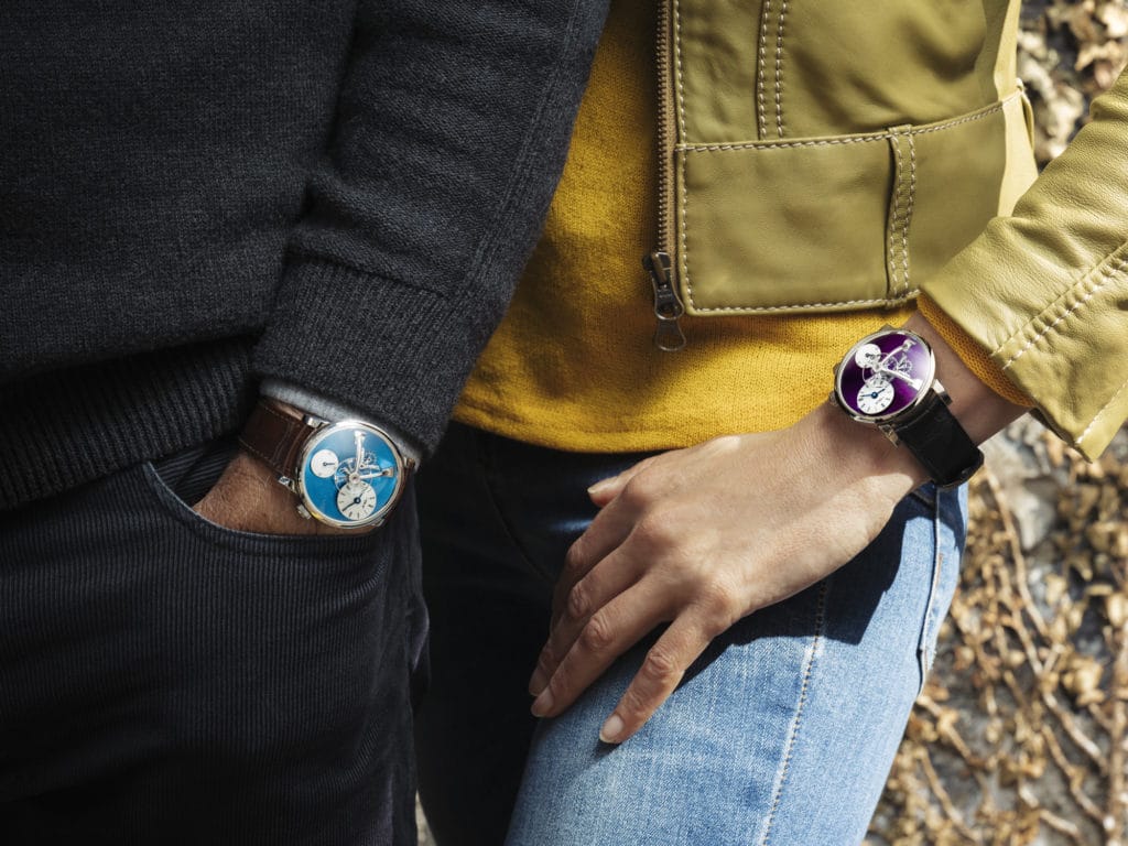 Visuellement, la LM101 est dominée par un grand balancier suspendu. Ses lentes oscillations incitent l’œil à se rapprocher. Les deux cadrans d’un blanc pur flottent un peu au-dessus de la platine finement soleillée du mouvement. En haut à droite, de superbes aiguilles bleuies contrastent avec le fond immaculé pour indiquer les heures et les minutes de manière très lisible. En-dessous, un cadran similaire mais plus petit affiche les 45 heures de la réserve de marche. Deux éditions limitées ‘Frost’ ajoutent encore plus de contraste entre ces éléments et le fond scintillant de la platine grenée à la main.