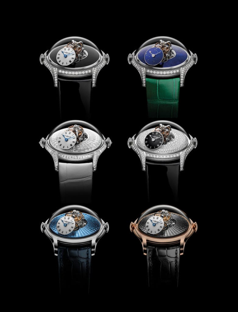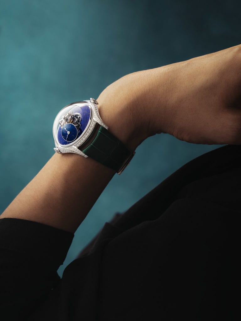 Un boîtier rond en or ou en platine, avec une lunette fortement cambrée et de fines attaches étirées souvent entièrement serties de diamants. Un dôme en verre saphir extrêmement bombé s’élève loin au-dessus de la lunette. En dessous, un cadran légèrement incurvé se pare de différentes finitions : laque tendue d’un noir profond, guilloché, lapis lazuli scintillant, ou diamants blancs d’un éclat éblouissant.